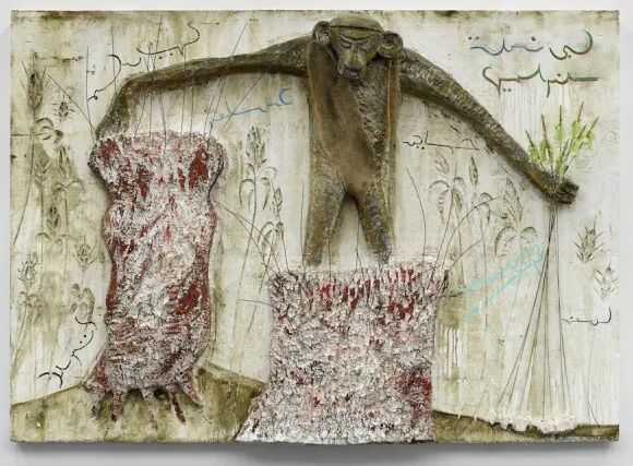 带有猿猴的丰收节浮雕 ,2008,彩绘聚苯乙烯泡沫塑料、钢、纸、纺织绳,176 x 252 x 35 cm
