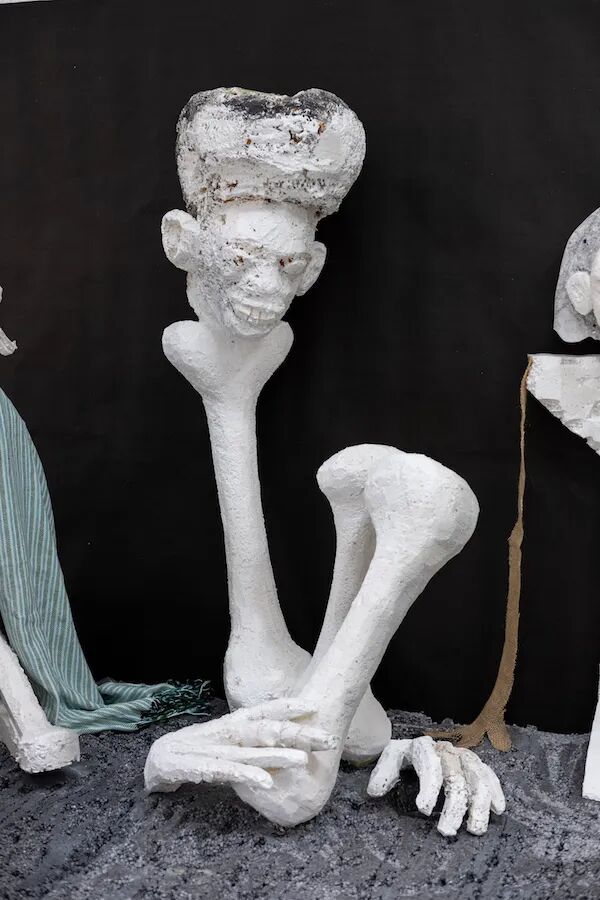 即使是睡眠, 2020 -雕塑组-,钢材、泡沫塑料、黄麻、布料、丙烯颜料、纸、干燥植物(lagurus ovatus)、玻璃、水、绳索、木材、砂浆纸板;215 x 450 x 100 厘米
