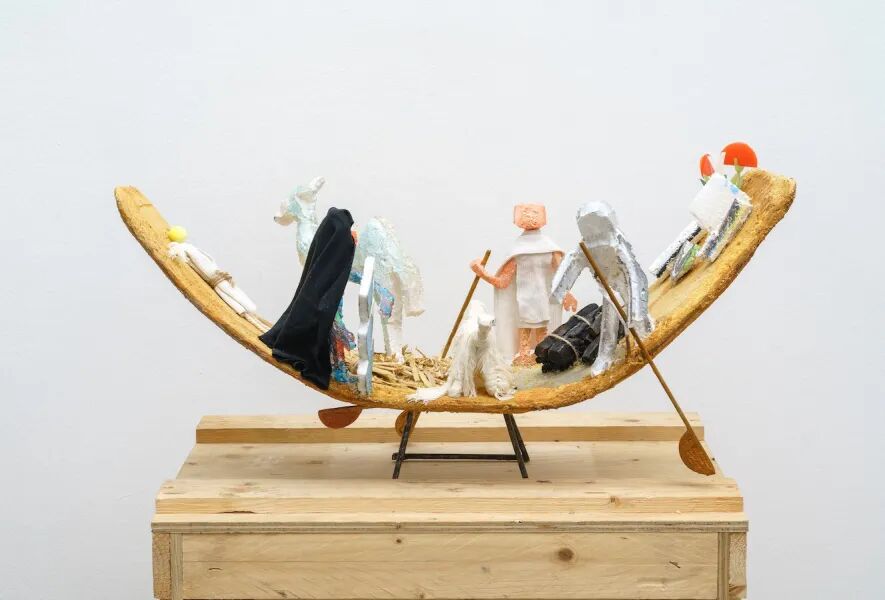 三桅帆船,2021,钢、泡沫塑料、木材、棉花、丙烯颜料、稻草、干草、纸,38 x 73 x 40 cm