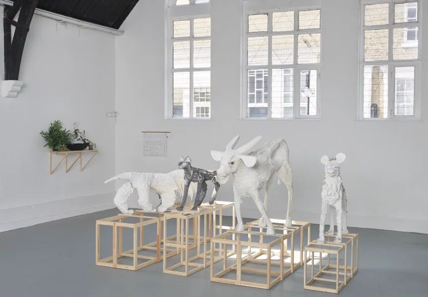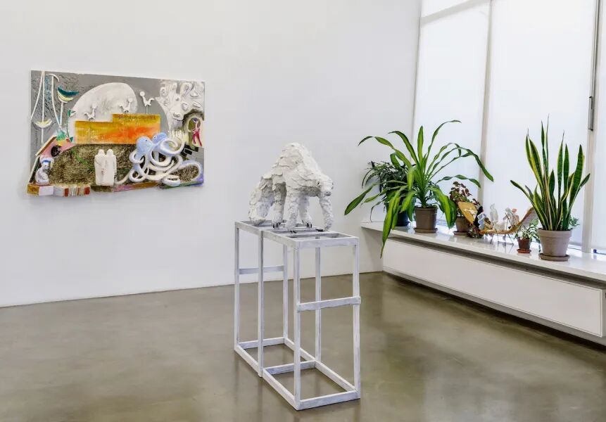 狐狸和叶猴, 2017,雕塑/泡沫塑料、丙烯颜料、木头、石膏,85 × 75 × 52 厘米