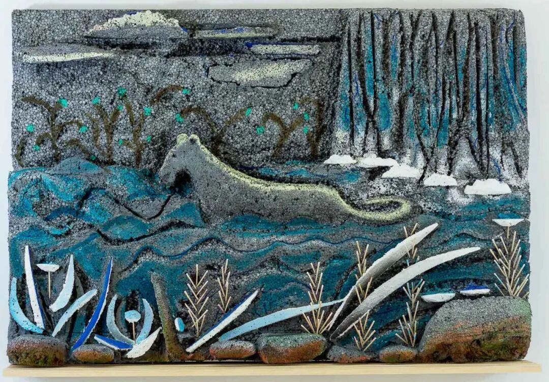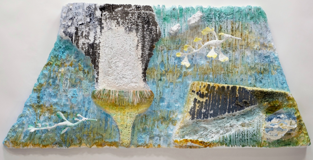 海龙水景,2020,浮雕:泡沫塑料、丙烯颜料、钢材、木头,71 × 156 × 20 cm
