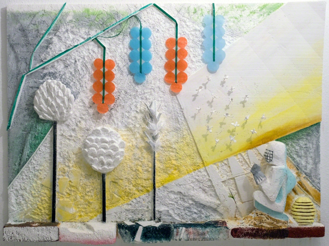 农业, 2017,浮雕/泡沫塑料、丙烯颜料、木头、钢材、绳索、纸,56 × 75 × 11 厘米