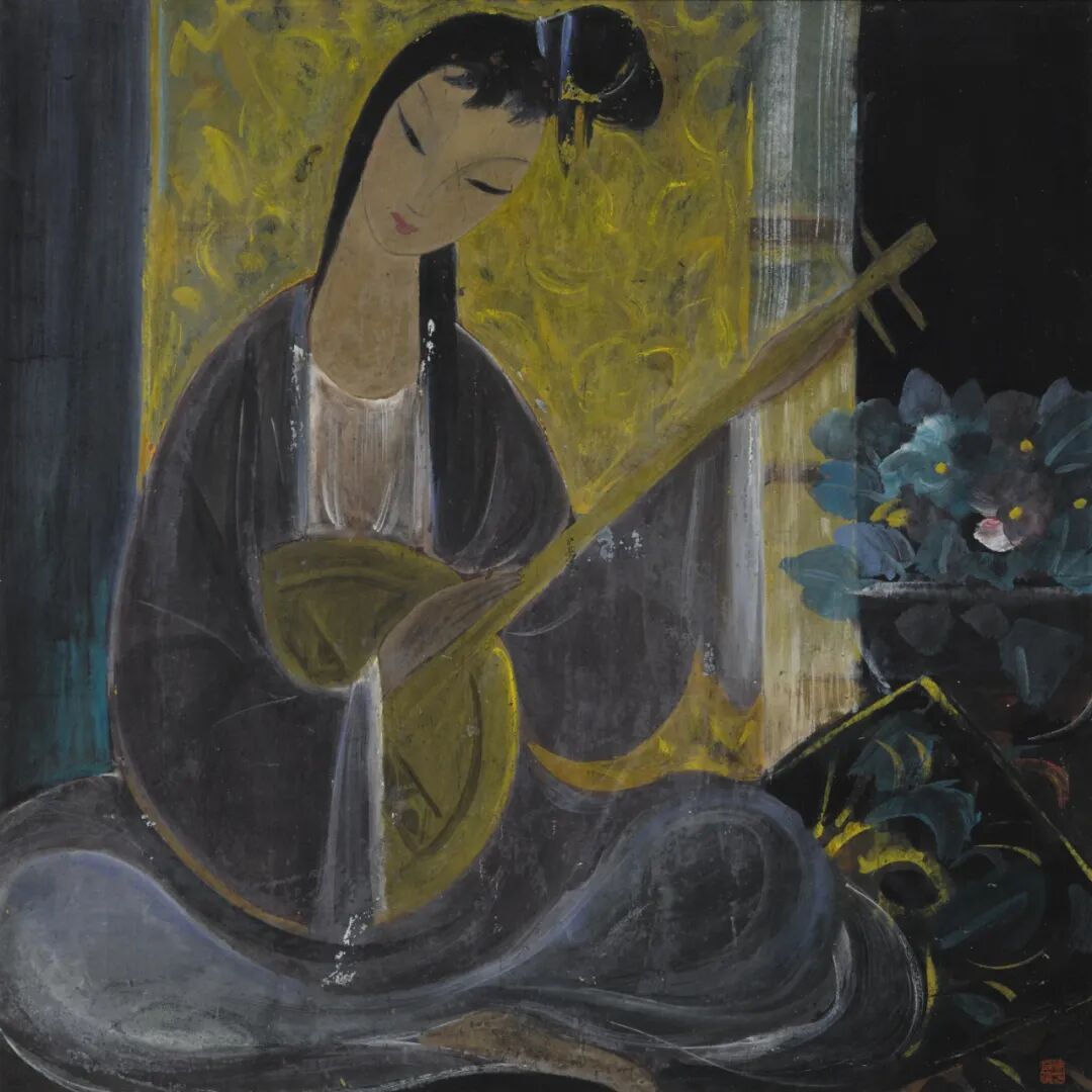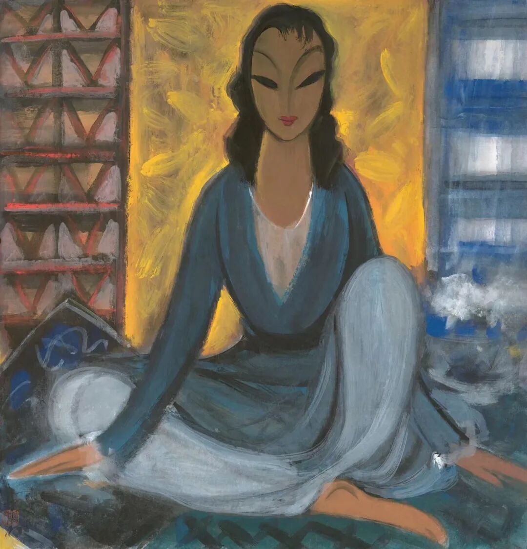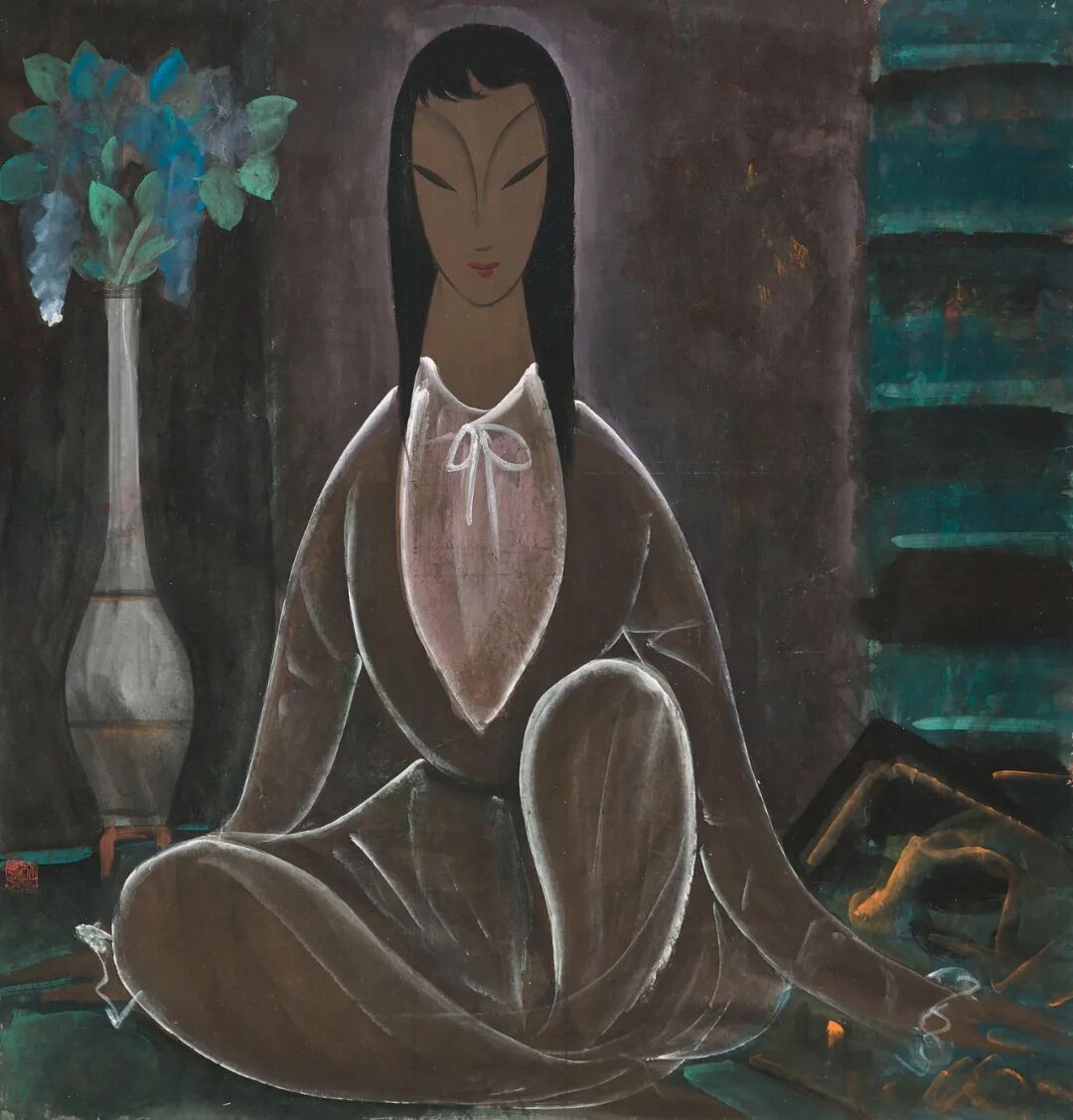 林风眠“新仕女”的灵感,部分来自中国的陶瓷艺术。唐宋的陶瓷,尤其宋瓷,有透明感,线条柔美。画中仕女盘坐着的姿态,犹如瓷器,令人不禁观赏再三,细意感受。