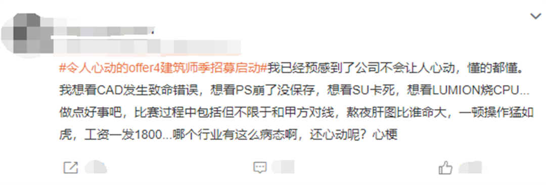 建筑行业大部分的工作情况:加班熬夜多、反复改图、工资不高,最近遇上疫情有很多公司大规模裁员,更是雪上加霜。