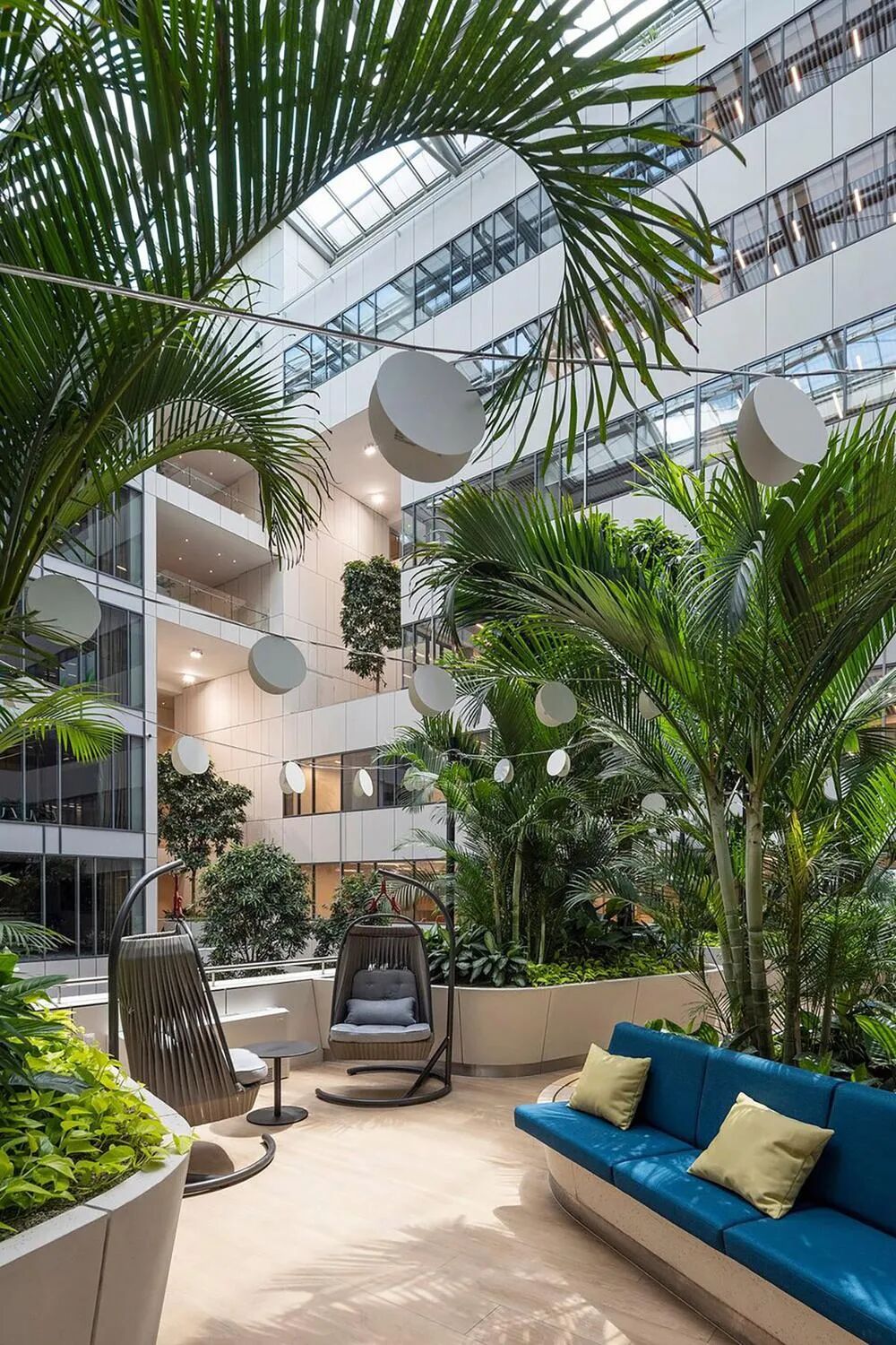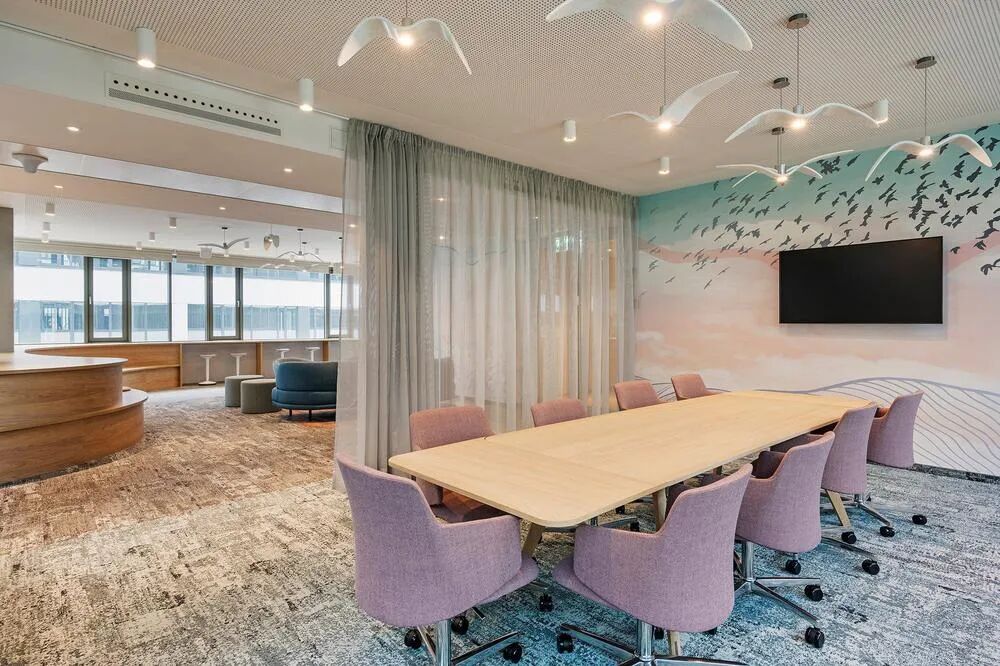 除了壮观的大堂、办公室和协作空间、餐厅、会议室和洽谈室外,还规划了一处创新共享工作空间。此外,室内随处可见许多私密和非正式的谈判场所。设计以水、天空和森林等主题创建各功能区域,这一设计方案也有助于员工明确自己在建筑内的方向和位置,同时赋予空间丰富的体验。