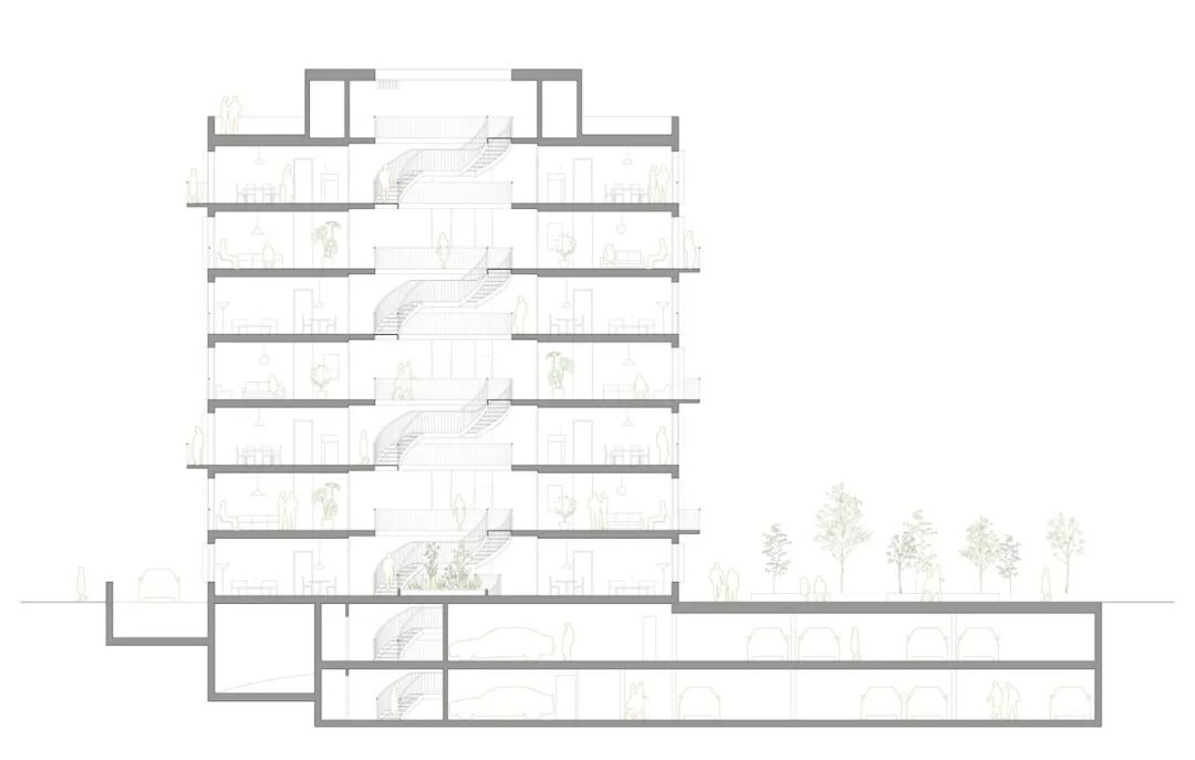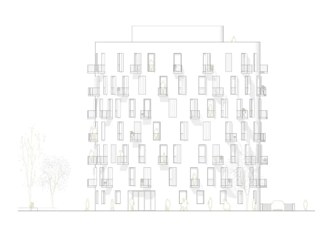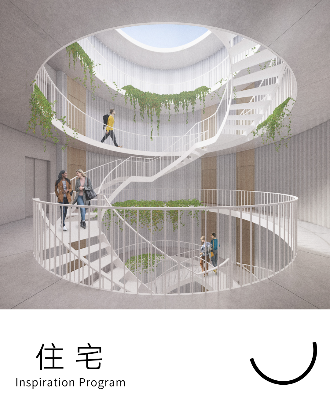 该提案致力于程序的灵活性。拟议的径向结构允许每层楼进行不同的类型变化,以根据需要适应更多或更少的住宅数量。提案中要强调的另一个要素是能源绩效。一方面,这座建筑是白色的,紧凑的,立面上的开口由窗框外的木制百叶窗控制。另一方面,通过天顶眼呼吸的内部空隙允许在夜间提取热量,并在白天通过一些遮阳篷保护其免受阳光照射。