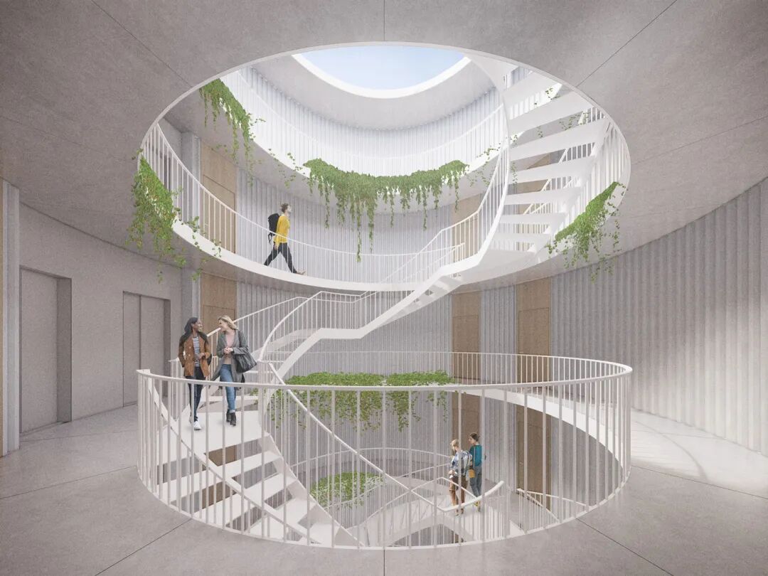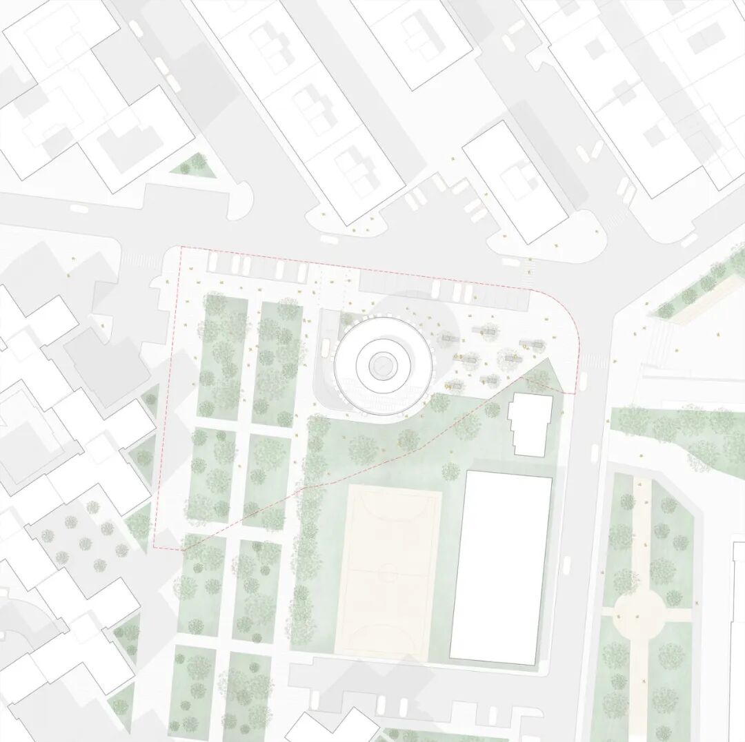 该地块位于复杂的城市环境中,是不同形态和建筑高度的交汇处。鉴于这种城市情况,建筑师提出了一座圆柱形建筑,一个清晰而引人注目的元素,与其相邻的空间和附近的建筑产生了强烈的对话。
