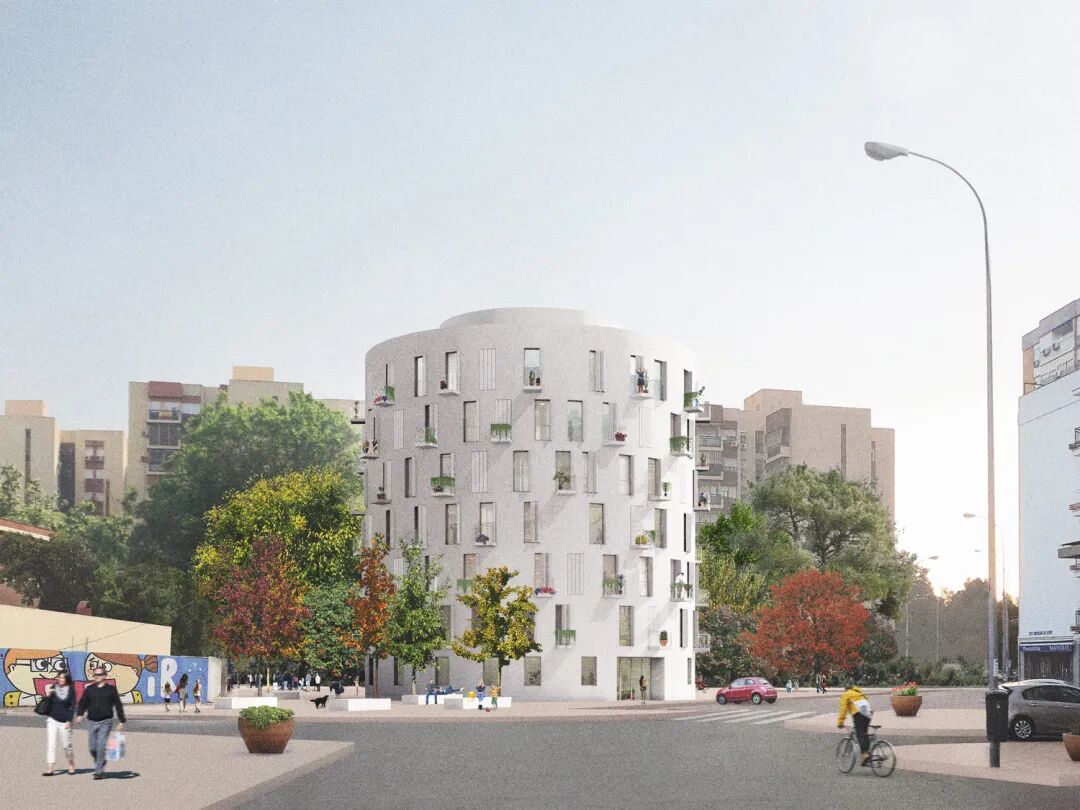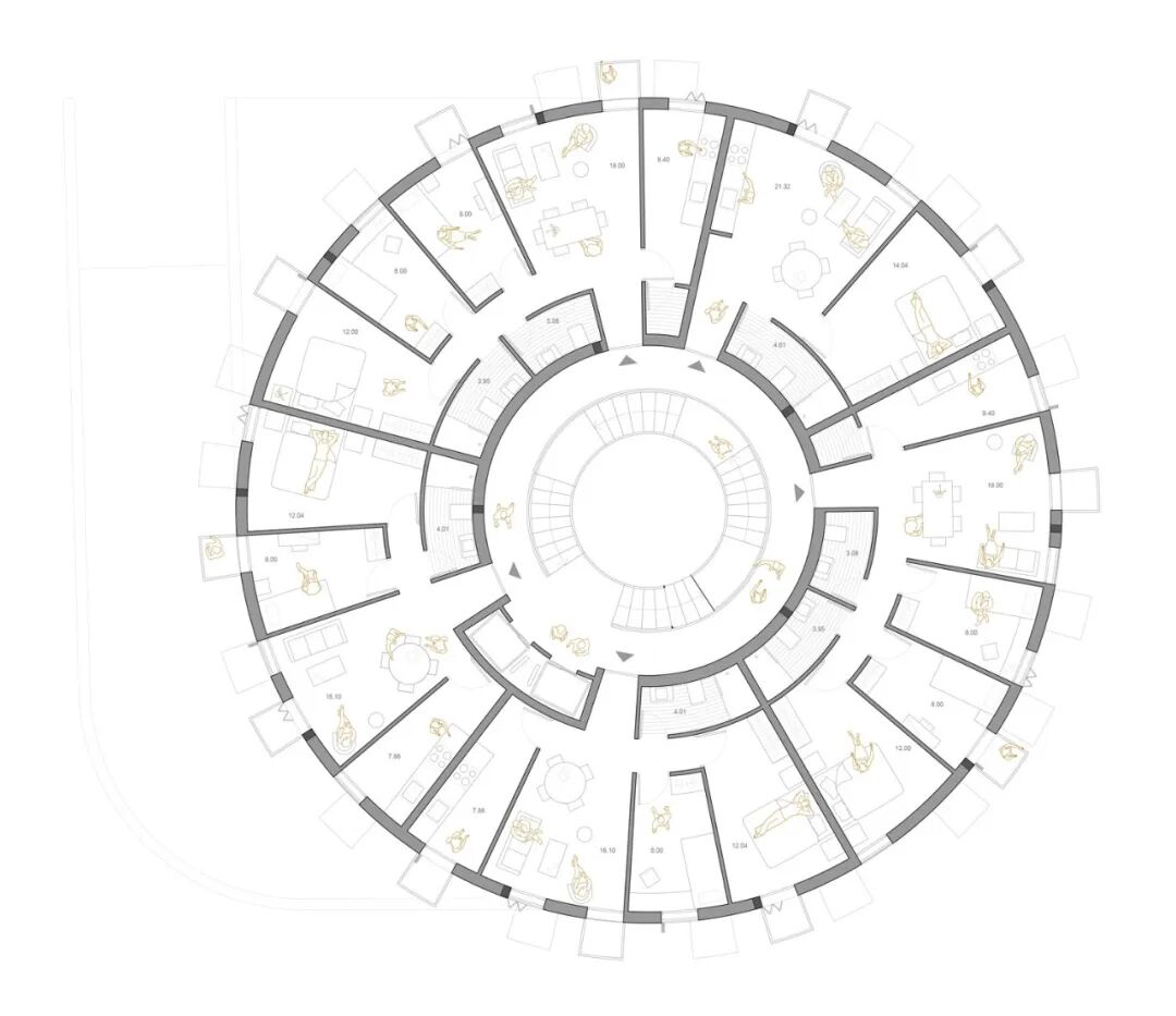 圆形类型允许在允许的可建区域内容纳最大数量的住宅,由最适合不同类型公寓的同心环组成:在中央空隙中,最小的圆形带包括唯一的垂直核心和进入住宅。以下带子构成了住宅:较窄的带子用于浴室和潮湿区域,较宽的带子用于住宅的白天和夜间区域以及厨房。最后,小的悬垂梯田强调了该项目的径向和同心理念。
