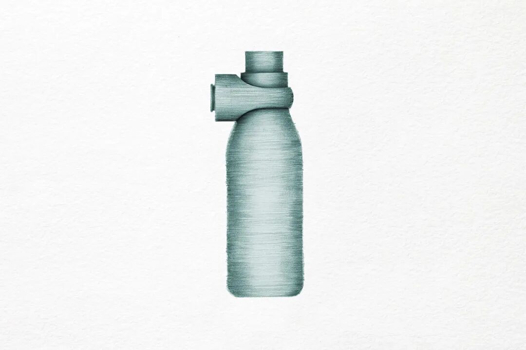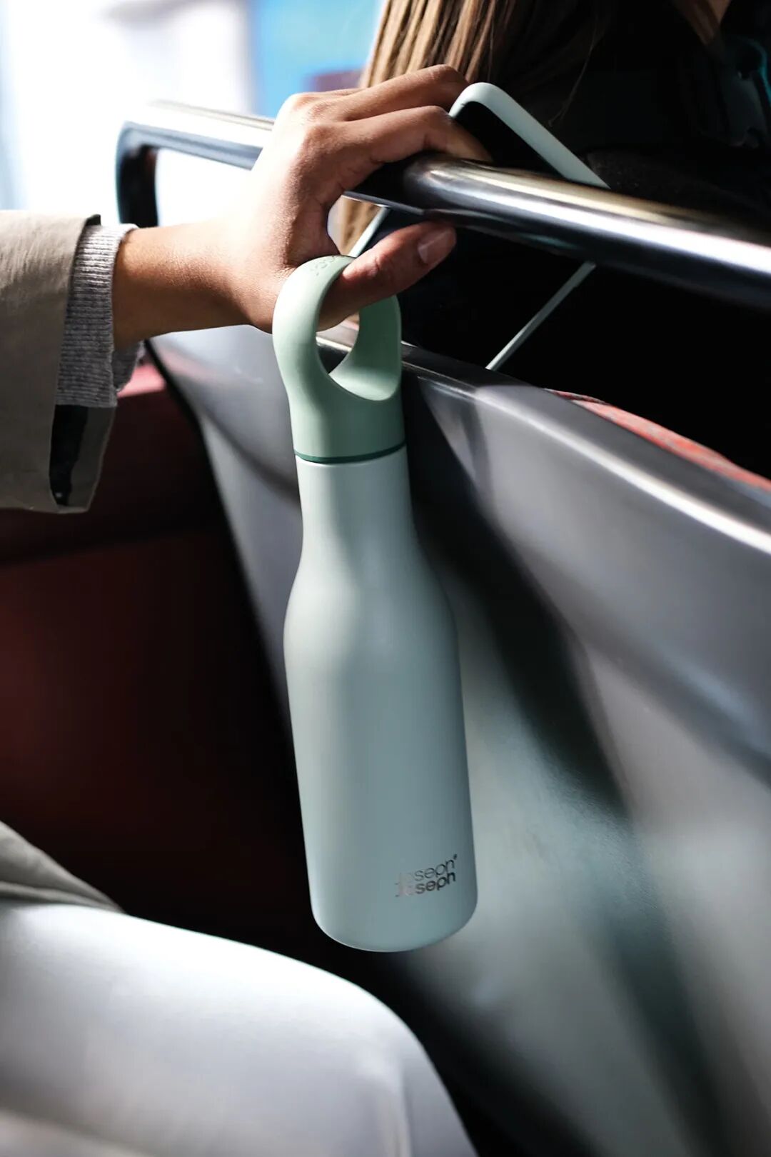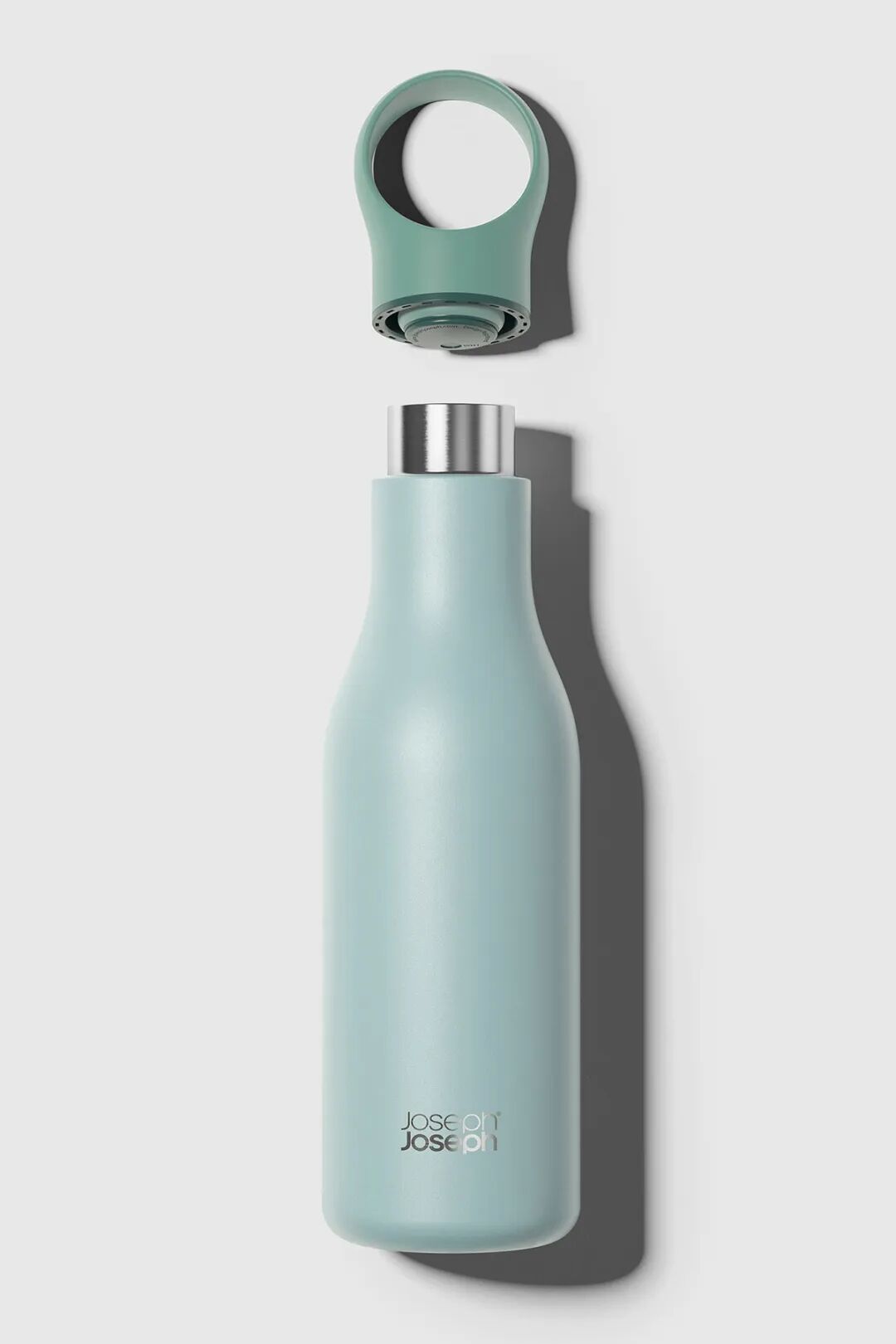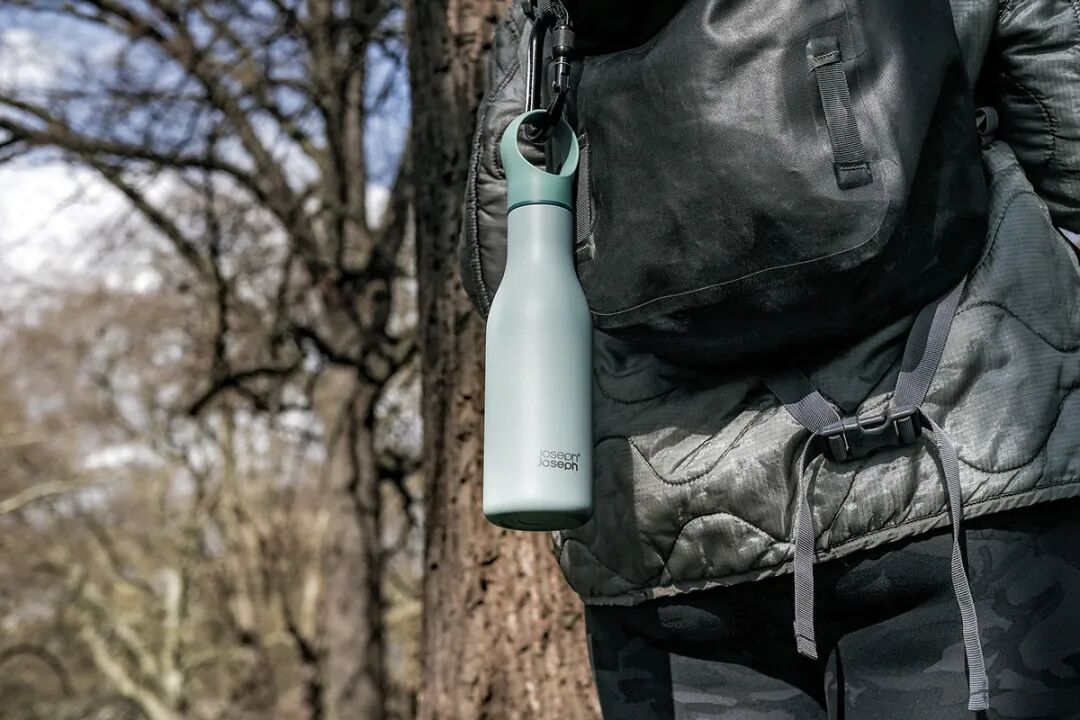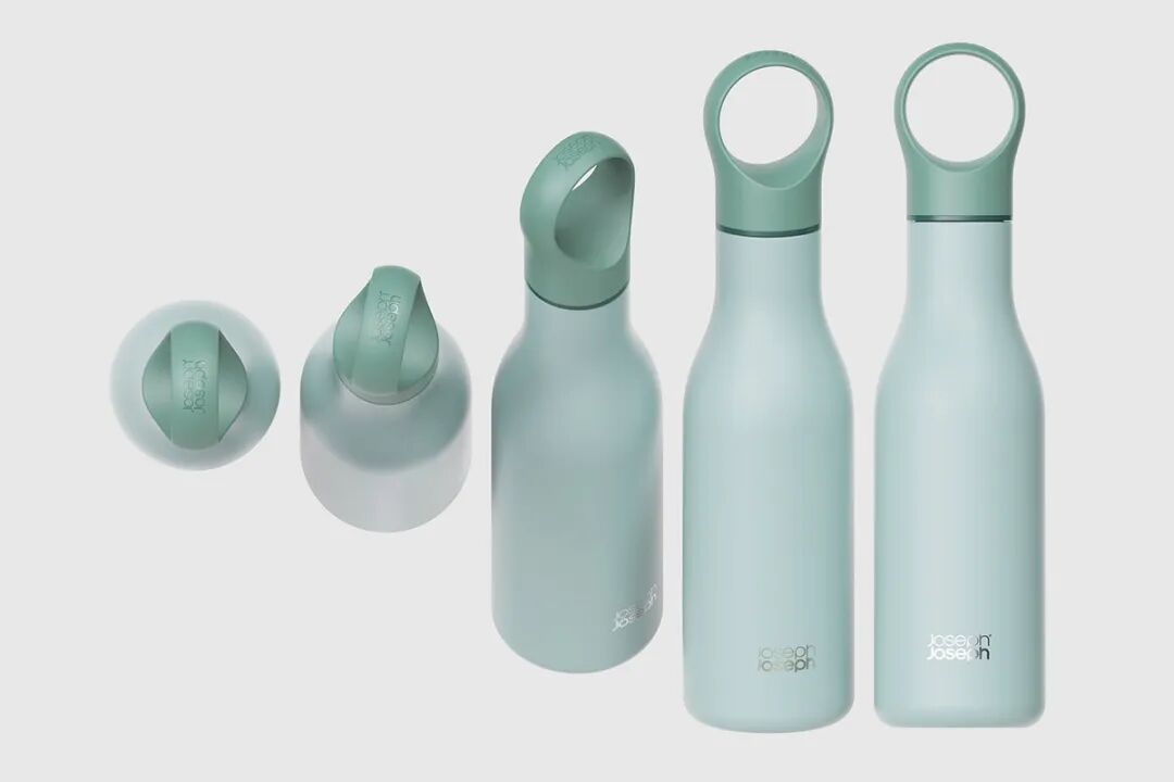 这款水瓶允许用户将盖子插在瓶颈上,为用户在饮用时提供方便和卫生的地方存放瓶盖。环内侧轻轻弯曲,与瓶子的轮廓匹配,紧密的摩擦配合防止它在用户饮用时滑动。此外,盖子兼作提手,还可以挂在袋子上,使水瓶方便携带。该产品由绝缘双壁真空钢制成。壶嘴上设计内螺纹,在外面留出干净卫生的饮用表面。出水口颈部很宽,还可以放入冰块。