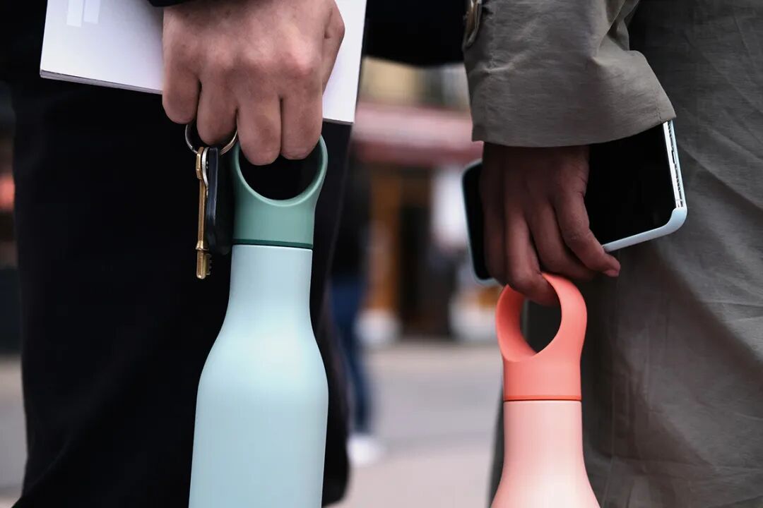 在伦敦市中心我们观察了人们如何使用水瓶,确定了几个痛点:首先,人们很难用其他物品去放置打开的瓶盖。其次,水瓶不方便抓握,人们只能用手夹着瓶口晃来晃去。