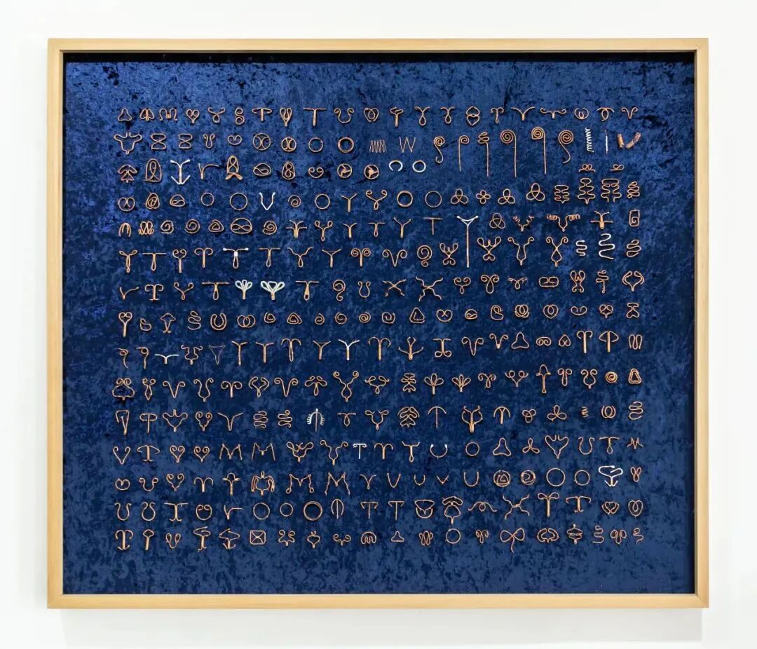 艺术家周雯静依照真实形状与尺寸,用早期制作节育环的材料 —— 铜 —— 还原了各型号的节育环。它们被挂在蓝丝绒上,如同一个个漂亮的首饰,直至人们凝视时,会由此联想到阴道、子宫、性、生育、健康、母亲,甚至母亲的母亲。