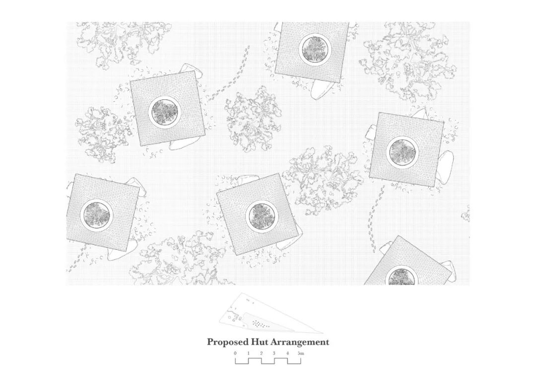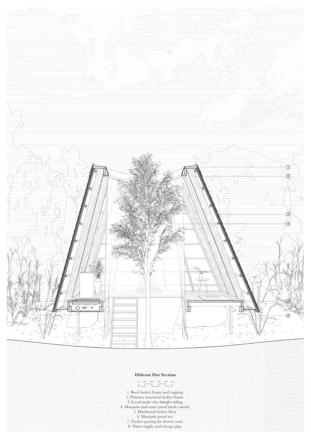 这个小屋的设计理念围绕着赋予生命的自然形式。柬埔寨的生态旅游成功地让人们意识到自然对健康和环境生物多样性的重要性,但它也同样揭示了全球变暖的持续威胁和森林砍伐造成的自然灾害。因此,葡萄藤度假村所独有的微构造小屋不仅可以保护自然之美,还可以崇敬自然之美。这为游客提供了建立更深层环境联系的机会。
