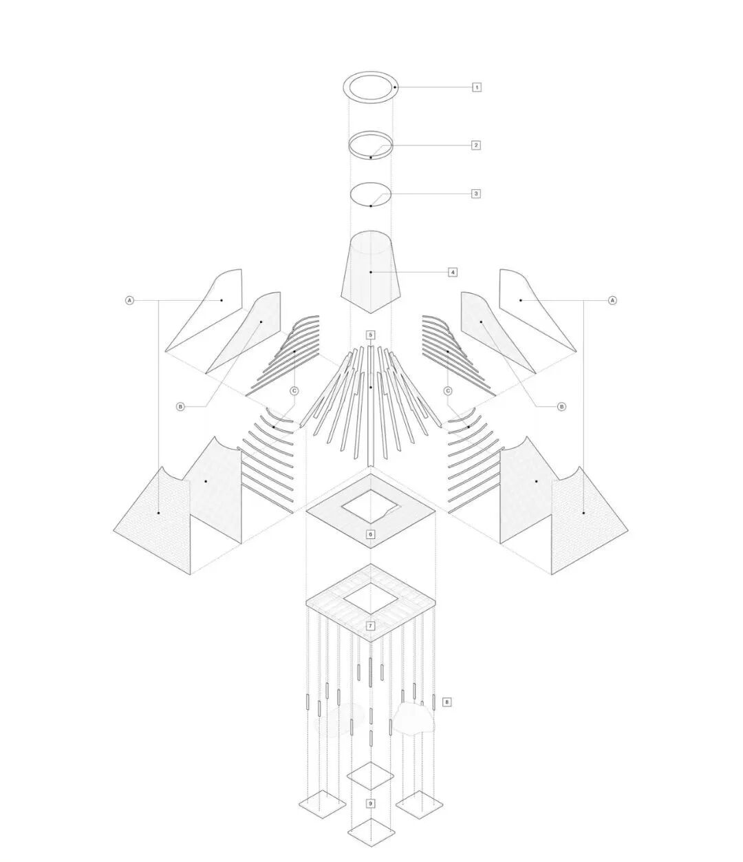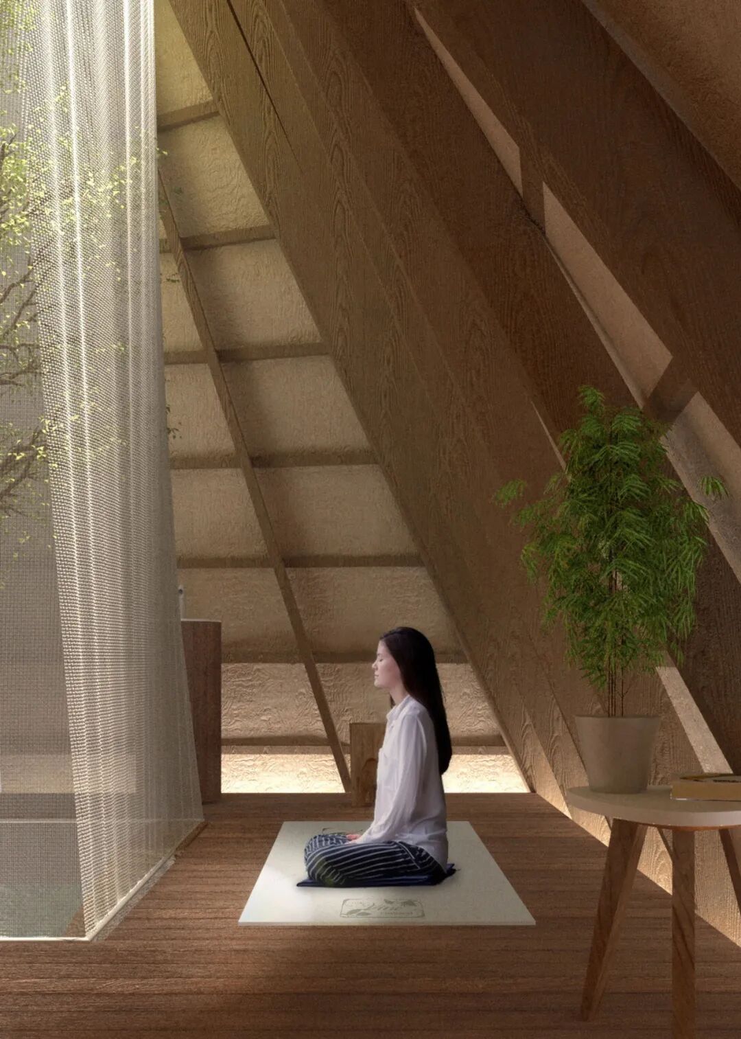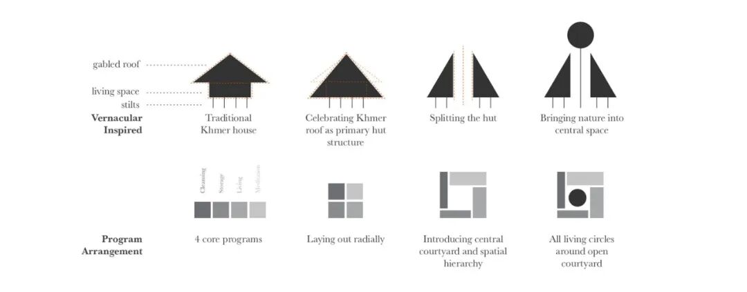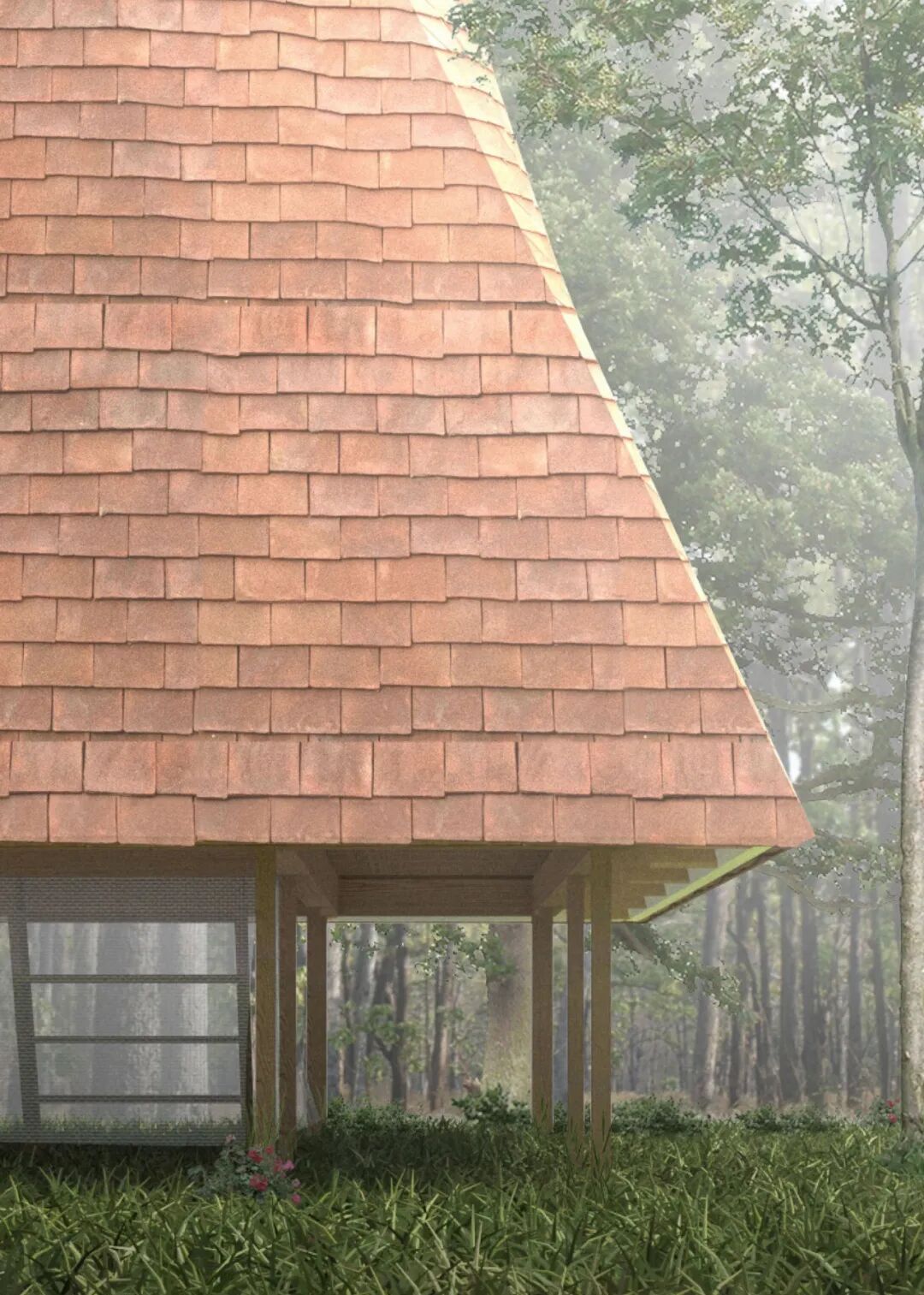 受柬埔寨传统高棉住宅的启发,这座新的微构造小屋强化了山墙屋顶的重要性,在高耸的生活平台周围建立了统一的屋顶。小屋不仅可以防止洪水泛滥,还可以轻松地将自己融入周围的景观中。设计的中心是庭院,将中心树周围的所有生活空间统一起来。睡眠、调解、锻炼、阅读或洗漱都围绕着这一大自然的核心部分。