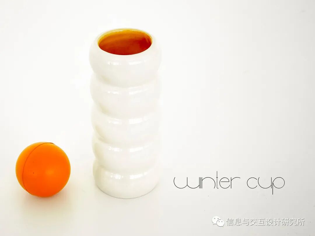 "冬季杯"是专门为冬季开发的。这个想法是在观察一群人之后产生的,这些人在冬季低温下倾向于饮用热饮和舒适的饮料,因此不仅在四肢,而且在身体的其他部位也有更多的关节和肌肉疼痛。该物体允许刺激受影响最大的肌肉,因为它的内部含有水或其他热饮,允许同时温暖身体和运输饮料(类似于一个术语),在寒冷的季节提供额外的舒适感。
