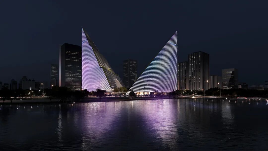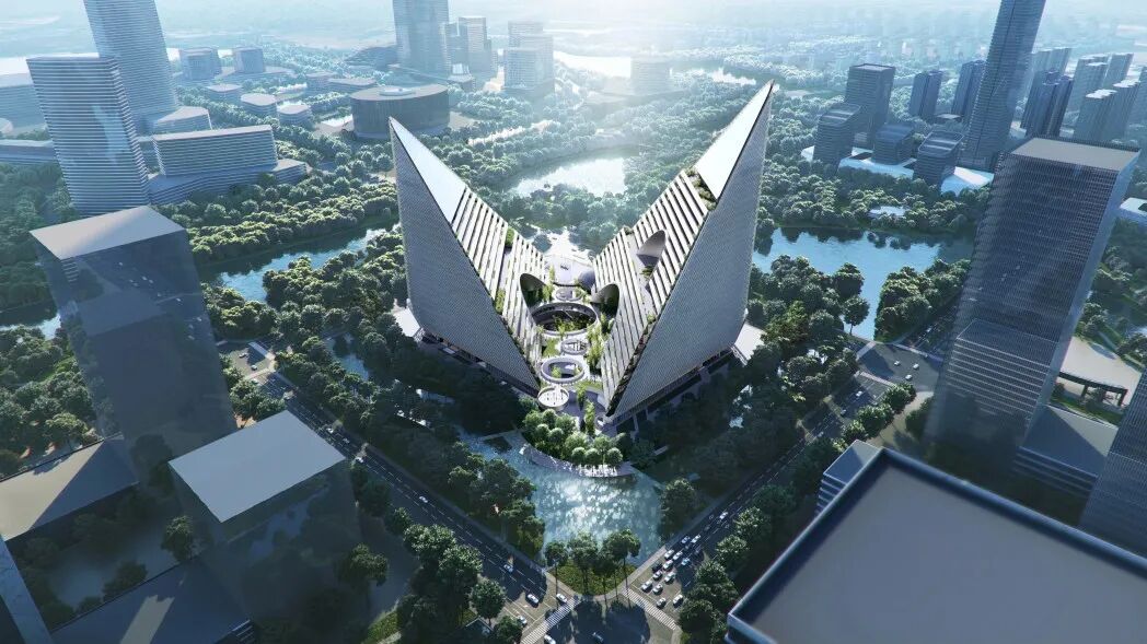 vivo人工智能全球研发中心借用重力法则,探索在垂直建筑空间里的城市场所营造。一条城市空间廊道斜穿场地,两个三角塔楼分倨两侧,形成一个山谷格局。三角形的体量将大尺度开放空间和公共功能沉淀于扩大的底层,同时把其它较小型开放空间提升到拥有开阔视野的高空,并且利用倾斜的体型为各层提供通常在高层建筑里少有的户外平台。建筑和周边水网共同构成一幅山水图景,为未来感的建筑增添一份诗意。