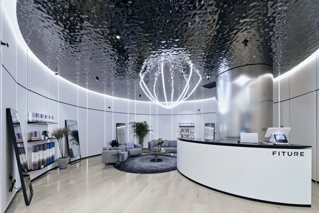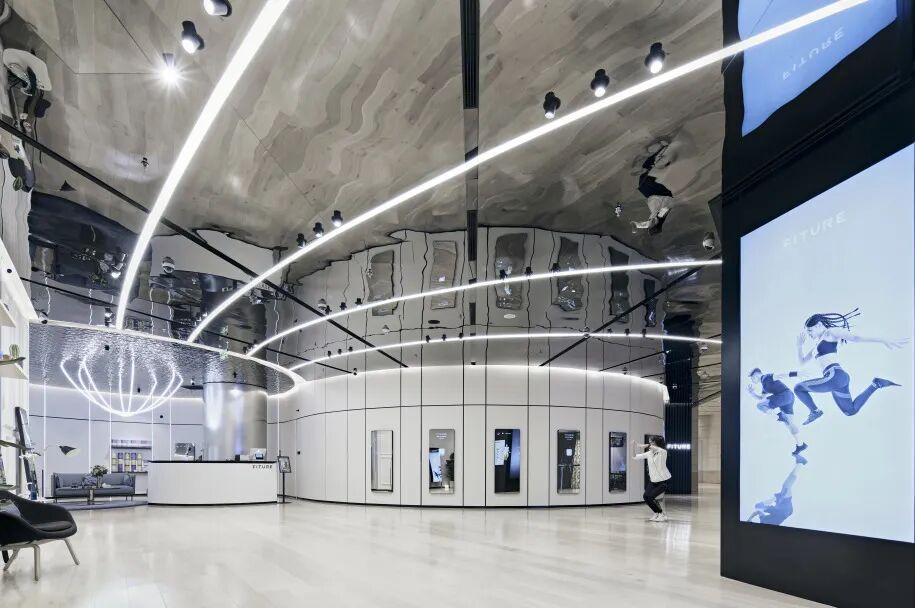 Fiture(魔镜)北京旗舰店的项目设计重新定义了运动场景,结合产品技术特性创造了革命性的体验环境。两个不同的VIP体验区,以及内置于弧形展示墙内的临时储物柜,给使用者带来了极大的便利。开放区域可提供适应性的零售体验,包括活动、课程和实时流媒体。设计运用数字化手法搭建了从办公室到家庭的不同使用场景,使顾客在不同环境空间内实现快速的体验转移。