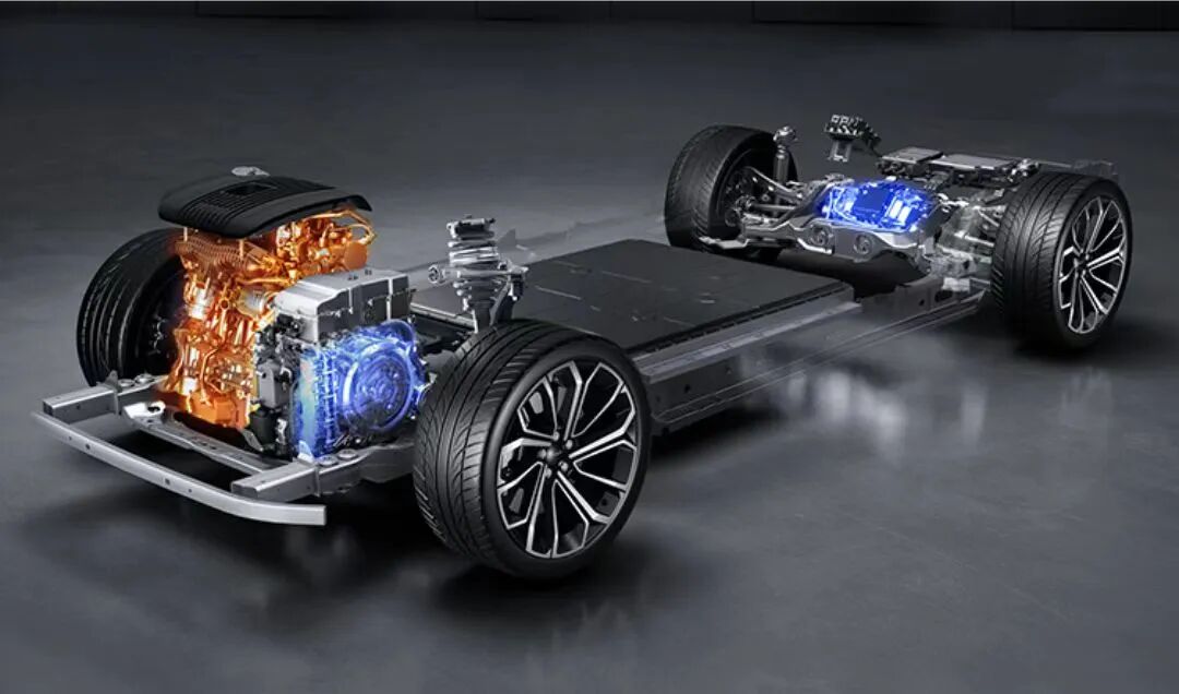 简单来说就是位于发动机曲轴的P1电机主要负责发电启动,位于发动机与变速箱中间的P2发动机和位于另一轴的P4发动机配合实现四驱动力。