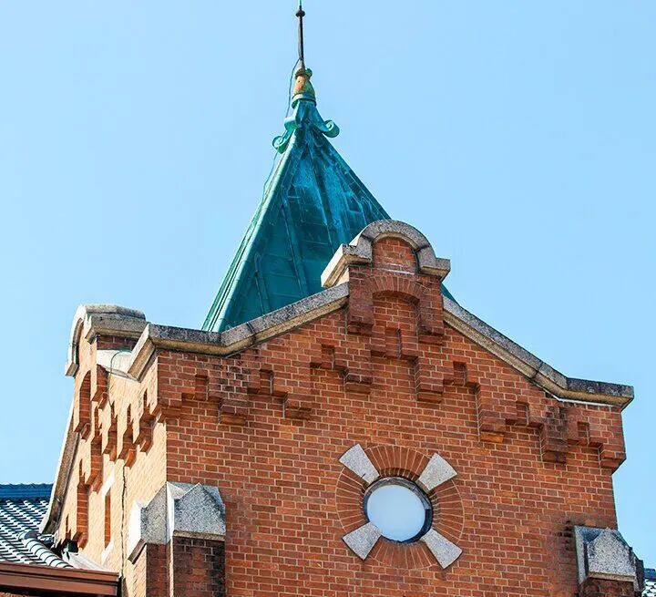 大楼的中心是一个带有绿松石镀铜屋顶的尖顶吗,尖顶顶部安装了避雷针,二楼顶部可以看到一个圆形窗户,上面有漂亮的花岗岩装饰。