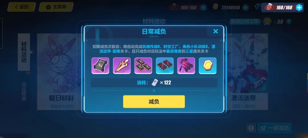 其次,游戏日常体验流程也在不断减负,游戏目前的资源关卡、开放世界日常任务和大部分战场关卡都可以选择一键完成,减负之后,玩家可以在两分钟内领完每日任务奖励——这些都是用减负机制层,进一步为内容向体验让步。