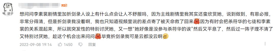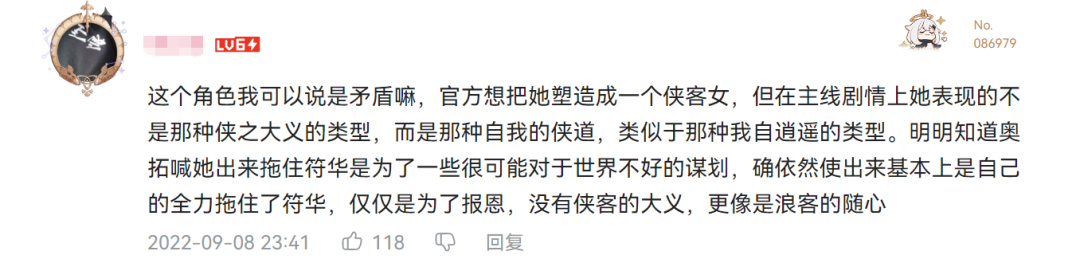 二是角色的立场和设定可谓“打破常规”,她并非主角团的一员,在故事中甚至与主角团有过冲突——在柯洛斯滕,她站在对立的立场,作为一位我方必须要跨越的对手登场;同时她也是符华的徒孙,而在视觉小说《神州折剑录》中,其母亲、师父和符华有过一段尖锐的往事。包括角色预告视频的下方,也有不少玩家在讨论这段关系。