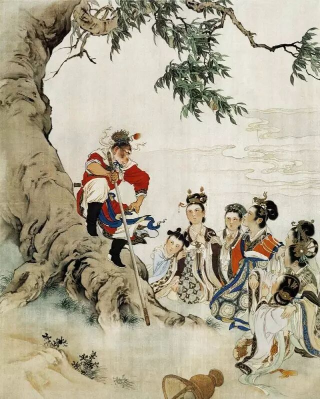 七仙女张望东西,只见向南枝上止有一个半红半白的桃子。青衣女用手扯下枝来,红衣女摘了,却将枝子望上一放。原来那大圣变做二寸长的个人儿,正睡在此枝,被他惊醒。大圣即现本相,耳躲里掣出金箍棒,幌一幌,碗来粗细,咄的一声道:“你是那方怪物,敢大胆偷摘我桃!”