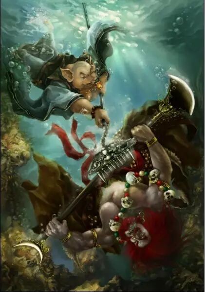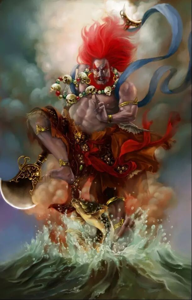 师徒们正看碑文,只听得那浪涌如山,波翻若岭,河当中滑辣的钻出一个妖精,十分凶丑:一头红焰发蓬松,两只圆睛亮似灯。不黑不青蓝靛脸,如雷如鼓老龙声。身披一领鹅黄氅,腰束双攒露白藤。项下骷髅悬九个,手持宝杖甚峥嵘。