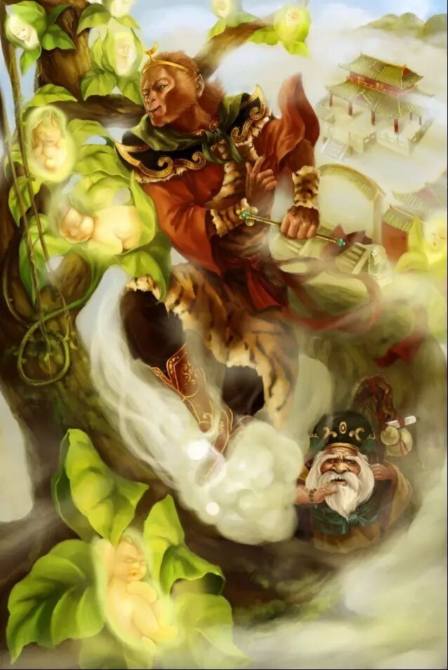 那座山正当顶上,有一块仙石。盖自开辟以来,每受天真地秀,日精月华,感之既久,遂有灵通之意。内育仙胞,一日迸裂,产一石卵,似圆球样大。因见风化作一个石猴。五官俱备,四肢皆全。便就学爬学走,拜了四方。目运两道金光,射冲斗府。