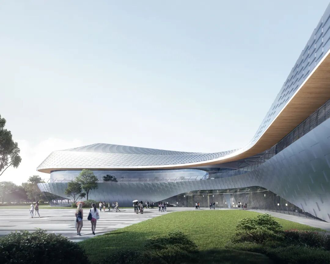 这个地标建筑位于虎山脚下的江山港畔,包括游泳馆与体育场两部分。设计以优美流动的线条勾勒出“江与山”的山水意境,旨在打造动感且兼具文化韵味的体育公园。
