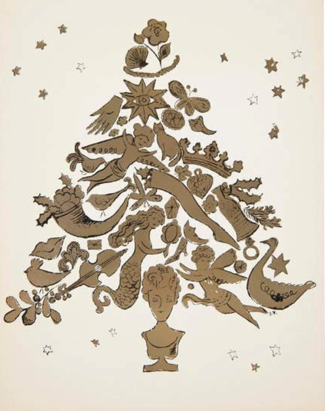 1956年,蒂芙尼公司委托沃霍尔设计圣诞贺卡,这很快成为他客户的年度活动,因为他精致的绘画将艺术家的品质带入了商品中。他异想天开的天使、淘气的小妖精、长袜和装满装饰品的树木体现了一种坦率的圣诞节愿景。