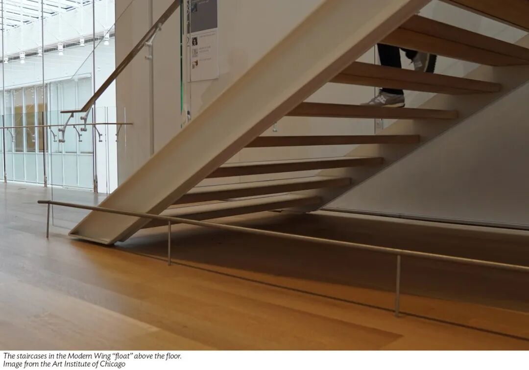 场馆里的楼梯也相同地表现了“漂浮”这一理念。台阶于台阶之间的空隙可以带来镂空的视觉效果,台阶的最底部也没有接触到地板,而是保持了1英寸的距离,给人一种悬空的感觉。