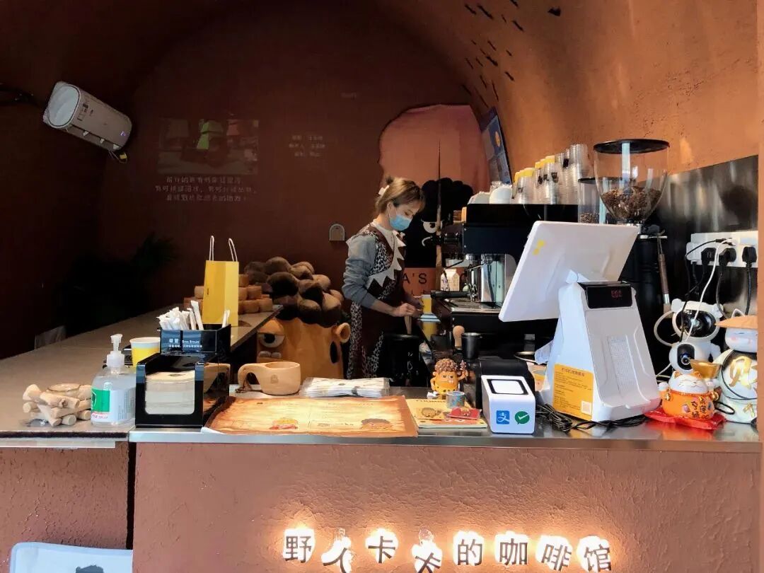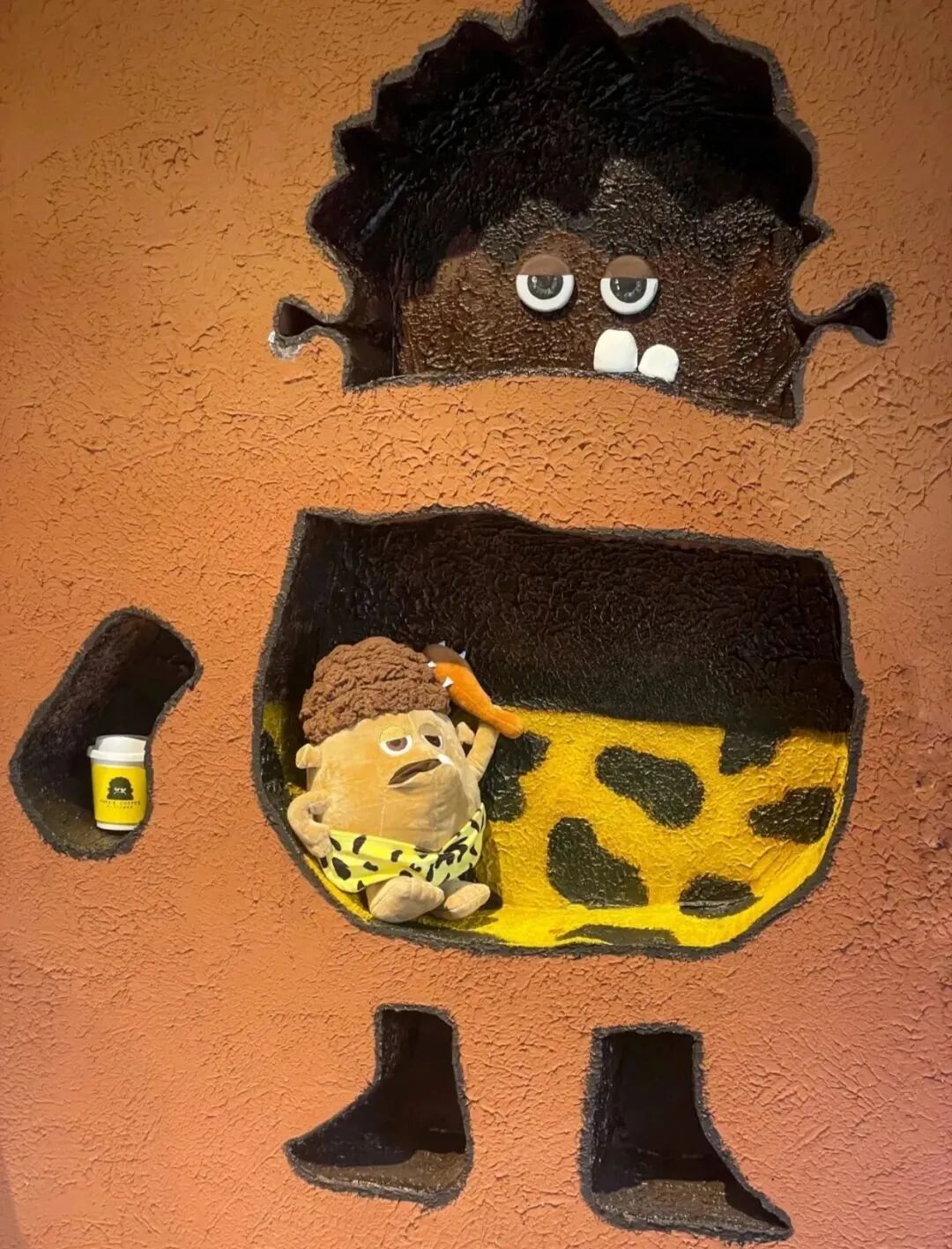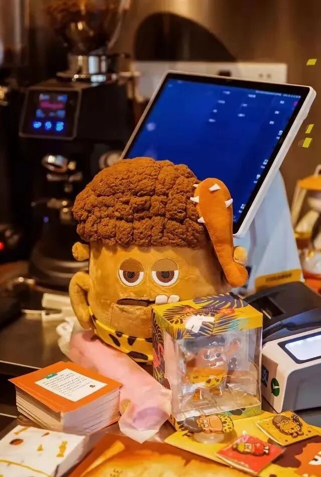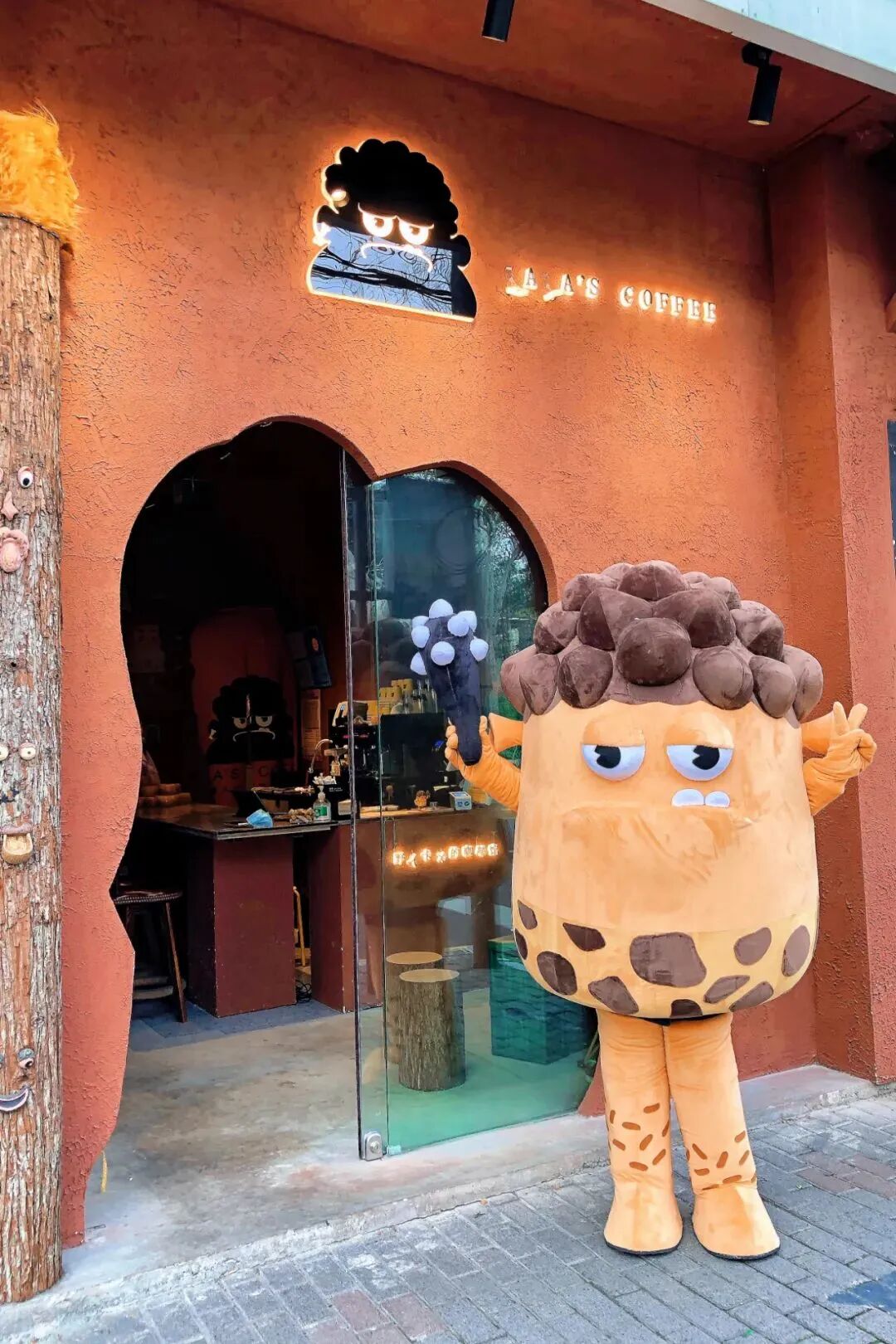店里是超级可爱的野人洞穴风格,随处可见的野人卡卡IP元素充满童趣,可以先在门口和玩偶合影,再走入店内点上一杯咖啡,观看野人卡卡的动画,沉浸在童真当中。