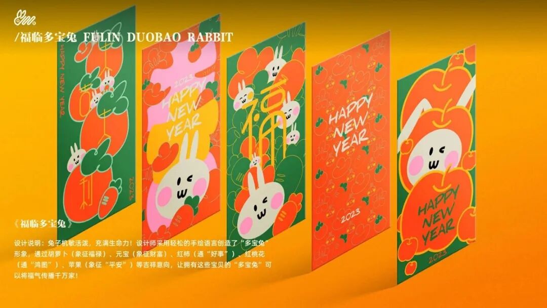 软萌可爱的兔兔形态被设计师进行了艺术化精简,圆润的线条与超萌的小眼睛小耳朵相搭配,俏皮劲儿呼之欲出,搭配传统纹样“铜钱纹”营造出了祥和喜庆的新春氛围。