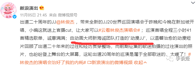 林俊杰是否亲口说过类似的话,手谈姬其实不太好验证了,在微博上可以看到粉丝这么说过,以及看似是林俊杰经纪公司给各娱乐媒体的通稿上写有“新海诚团队”的内容