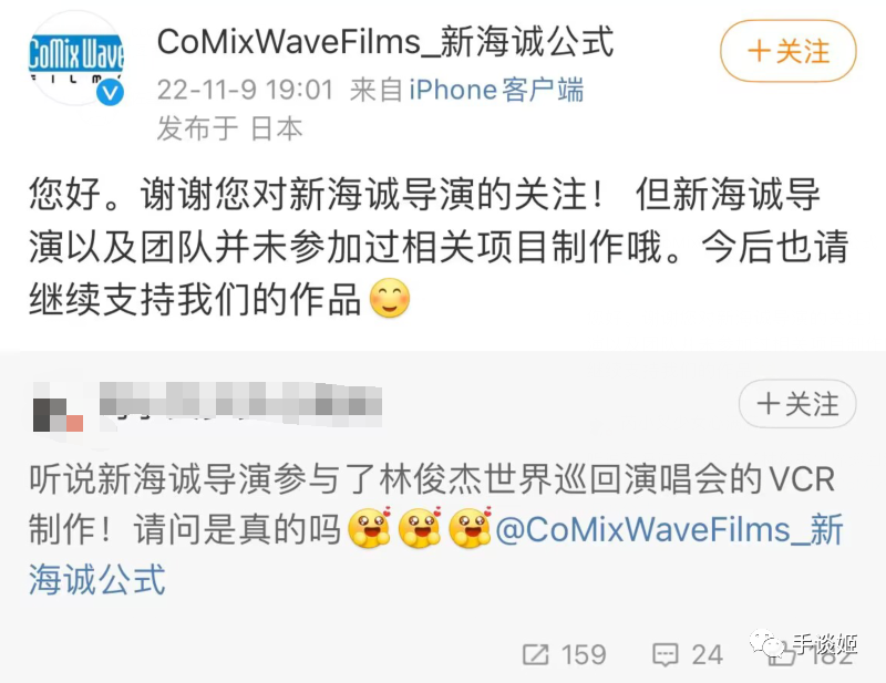 聊天记录发酵,新海诚官方回应后,又过了一天,林俊杰的经纪公司,林俊杰演唱会的官方微博,以及台湾必应创造音乐公司,转发了由台湾空壳影像发布的不像道歉声明更像是感谢声明的声明。