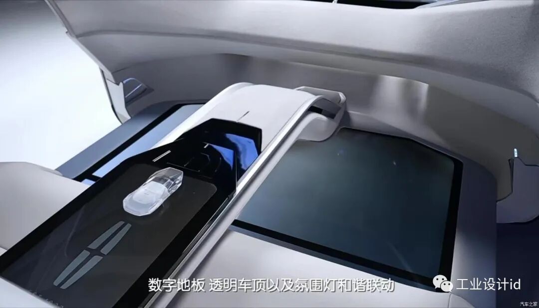 进入到车内,可以看到新车并没有配备方向盘和仪表板,这是一款能够实现全自动驾驶的概念车。内部只是在中央通道区域配备一个交互屏幕,另外,它的地板也是一块屏幕,可以转换不同的主题显示。