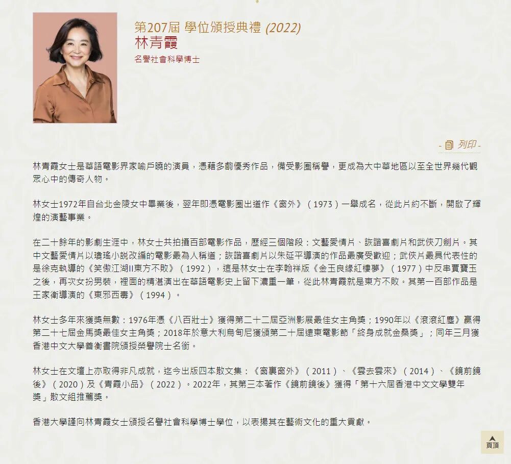 近日,香港大学官网发布公告称,将于11月2日(星期三)在校本部大楼陆佑堂举行第二百零七届学位颁授典礼,颁授名誉博士学位予林青霞女士,“以表扬其在艺术文化的重大贡献”,并赞其是“大中华地区以至全世界几代观众心中的传奇人物”。