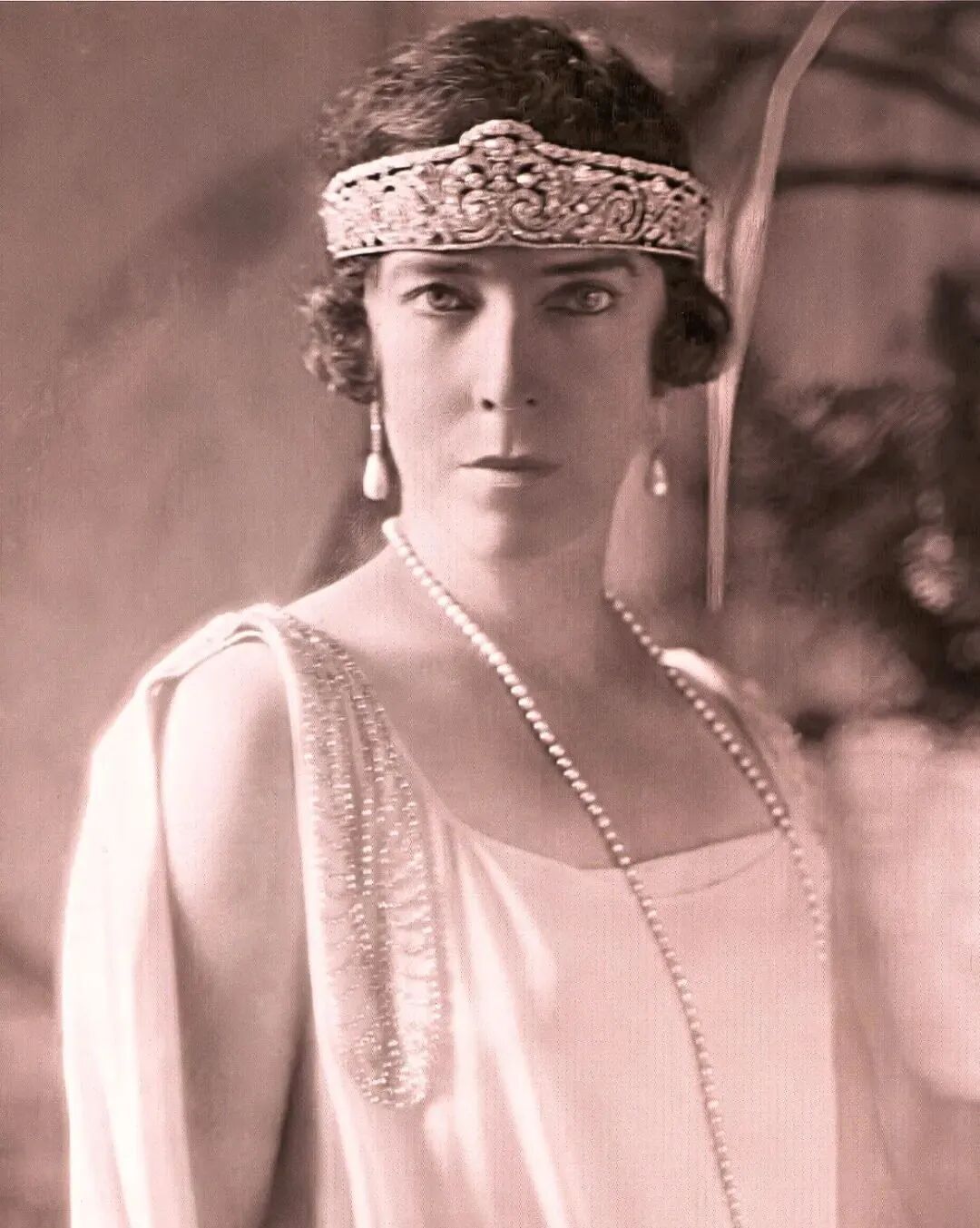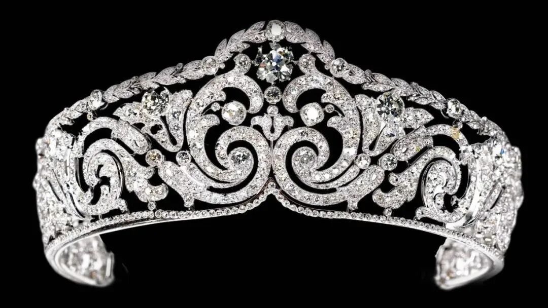1910年,卡地亚为比利时的伊丽莎白王后,定制了一款犹如“蕾丝”般的花环风格冠冕——卷轴式冠冕。卷叶和月桂叶设计象征尊贵的皇权,铂金镶嵌钻石绽放着永恒光芒。后来那顶王冠被伊丽莎白王后的家族后人拍卖,兜兜转转又被卡地亚买了回去。