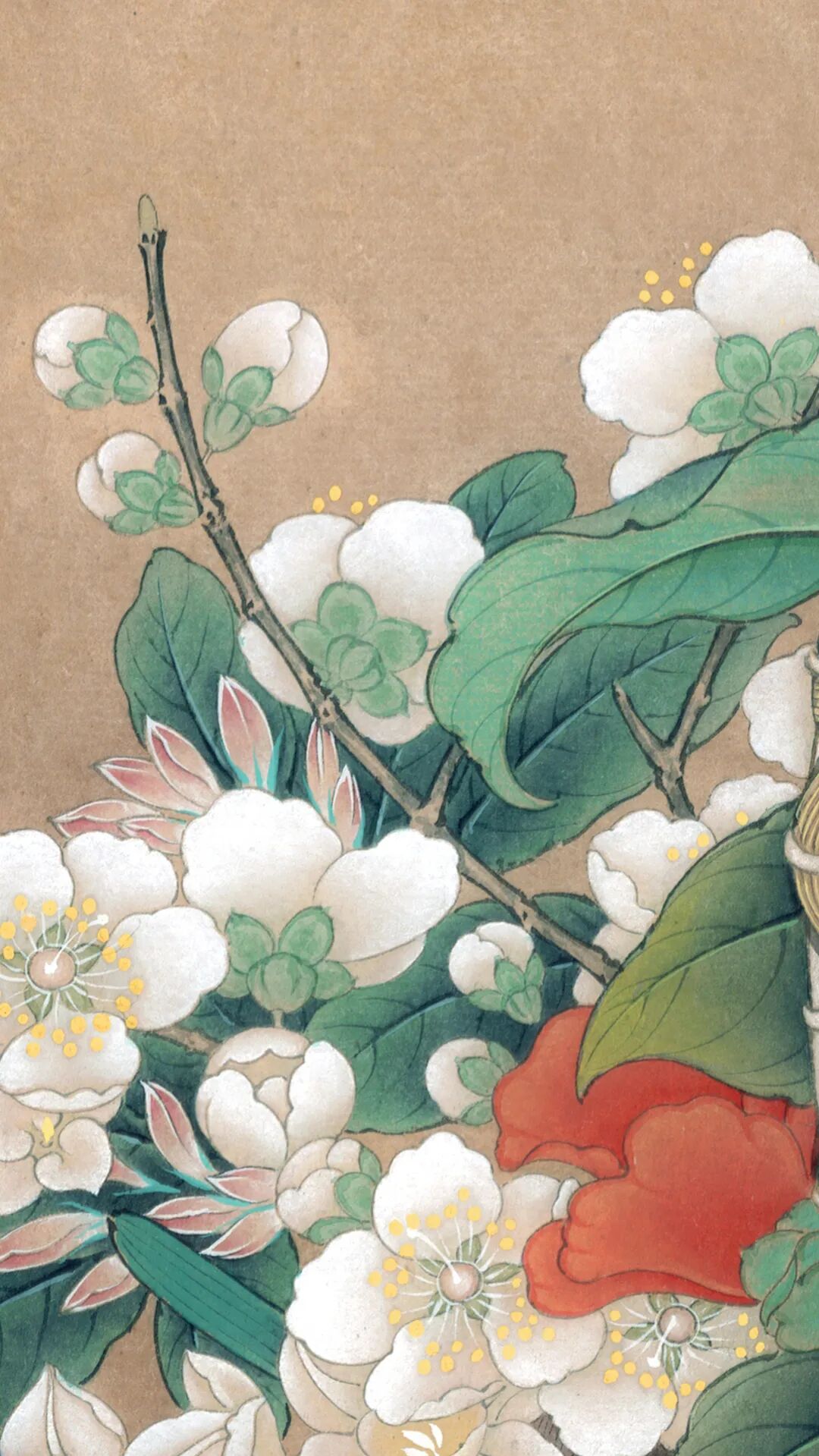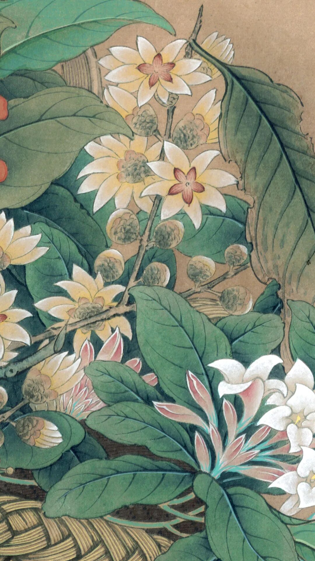 厚质感。浓白粉勾出雌蕊并点尖端圆点,浓粉黄色(藤黄加白色)点雄蕊,干后,雄蕊的中间点淡朱磲。萼片和反叶,用薄翠绿勒边并勾勒细叶脉,其中,反叶的主筋用薄四绿色(三绿加白色)复勒。老干:罩染薄翠绿后中墨局部复勾墨线模糊处。正叶;整体平涂薄草绿(藤黄加花青),最前方和左