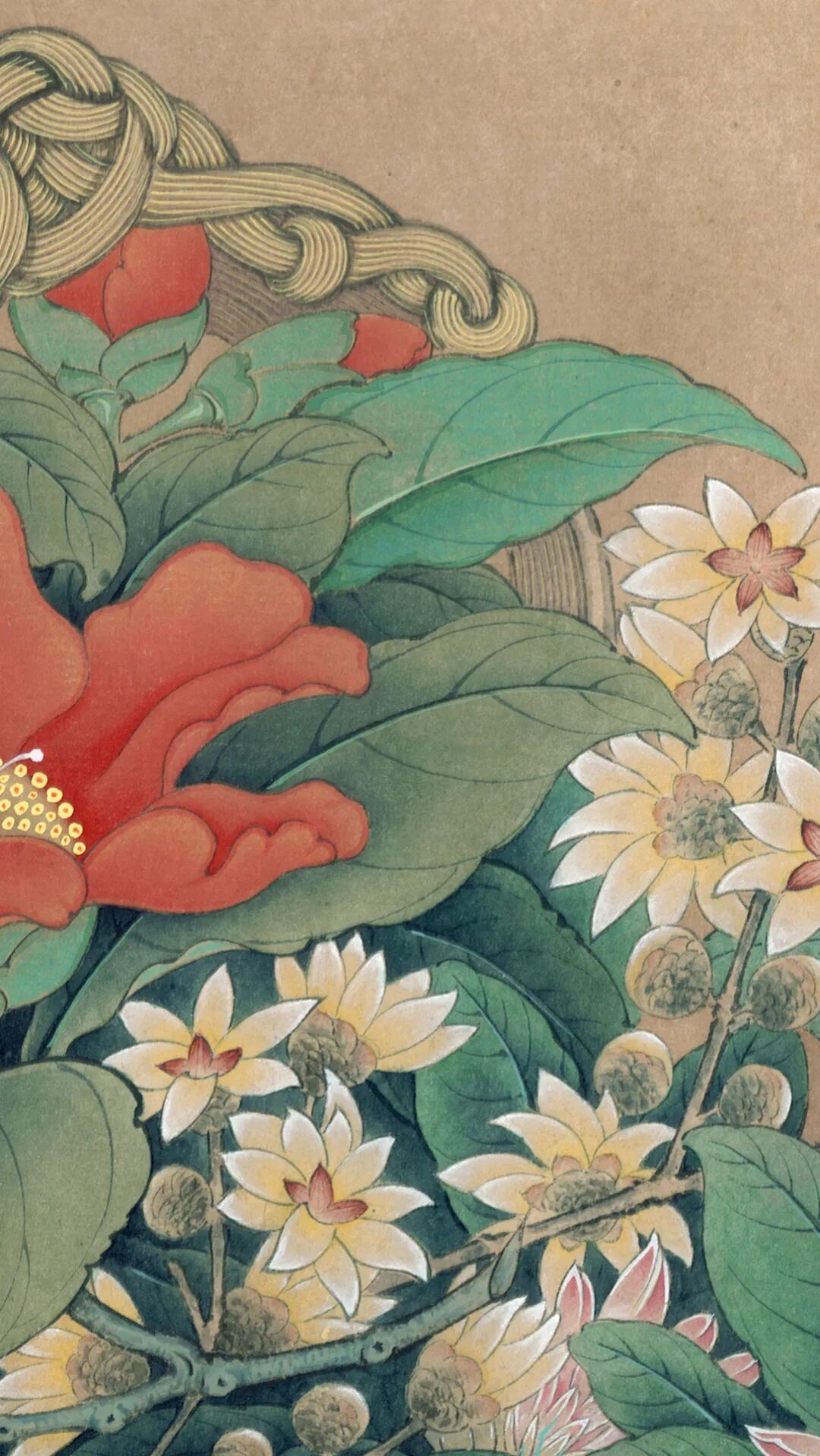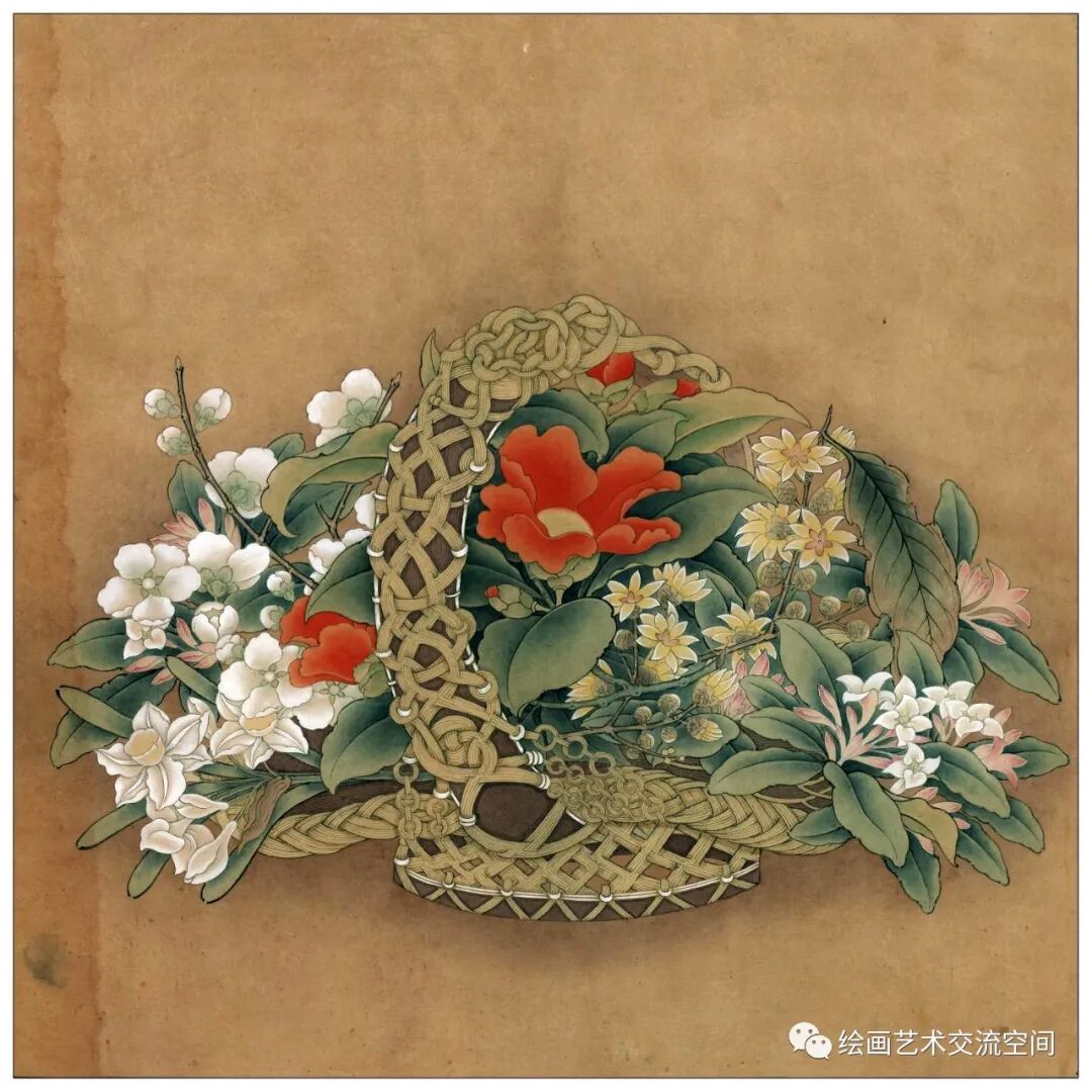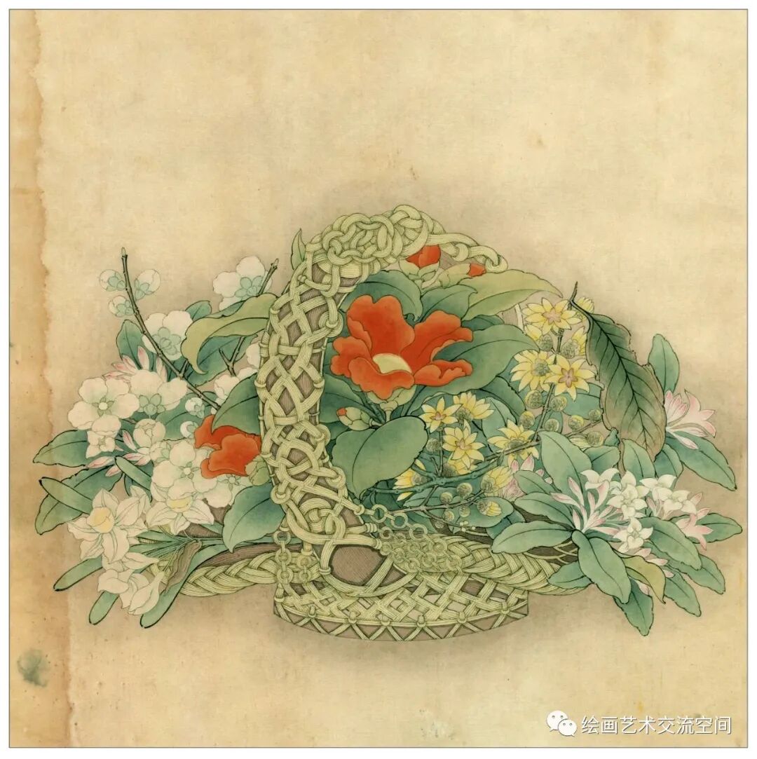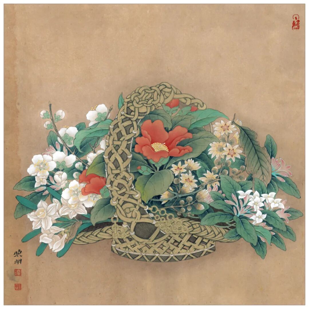 这幅《花篮图页》的作者李嵩是南宋著名的院画家,历任光宗、宁宗、理宗三朝画院待诏。他擅画人物、山水、界画等,是一位较全面的画家,在他的作品中,大多为现实的题材。精致、典雅的籐篮里,一朵朵盛放的花朵,鲜丽而缤纷。大红的山茶稳坐居中,艳冠群芳:清雅的绿萼梅、闺秀般的瑞香,斜倚着身子相随干旁;白净的水仙、娇俏的腊梅则好奇趴伏在篮缘。