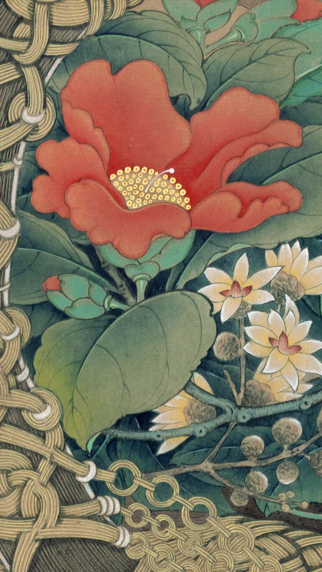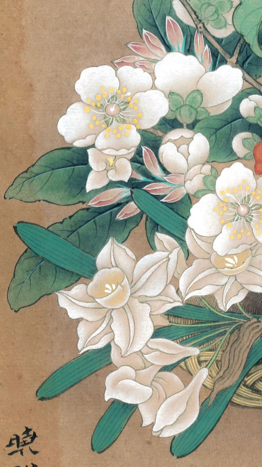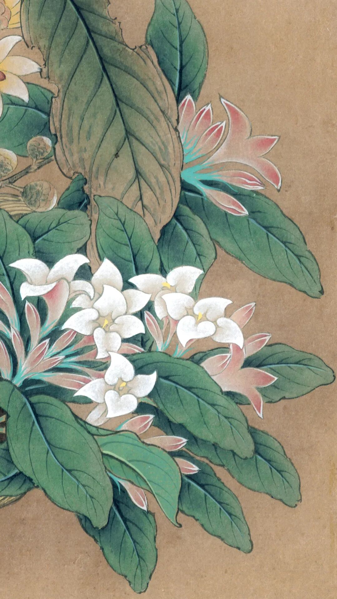 这幅《花篮图页》的作者李嵩是南宋著名的院画家,历任光宗、宁宗、理宗三朝画院待诏。他擅画人物、山水、界画等,是一位较全面的画家,在他的作品中,大多为现实的题材。精致、典雅的籐篮里,一朵朵盛放的花朵,鲜丽而缤纷。大红的山茶稳坐居中,艳冠群芳:清雅的绿萼梅、闺秀般的瑞香,斜倚着身子相随干旁;白净的水仙、娇俏的腊梅则好奇趴伏在篮缘。