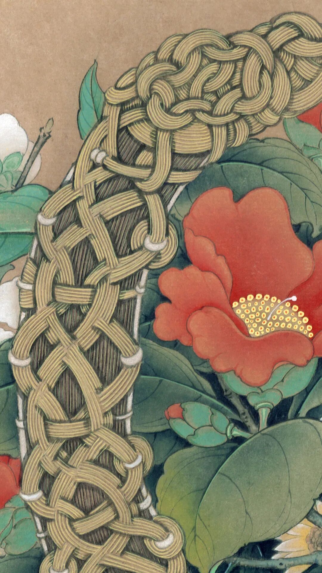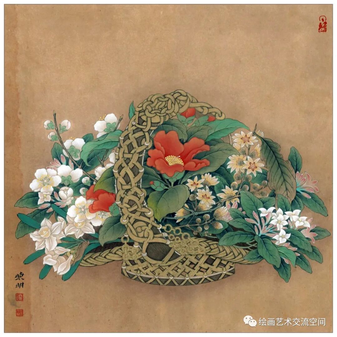 本作,勾线时,不用过多的考虑线条的浓淡变化,而应将主要的精力放在线条的粗细变化以及笔法的多样性上。比如,狗牙梅的叶片行笔粗壮,叶脉以钉头鼠尾描为之。而绿尊梅的勾线基本上都是游丝描,老干的部分的用笔大多以方折笔入画,但是茶花的的叶片则大多以圆润的铁线描来表现。花篮的竹质篾丝的勾勒也需要注意笔法的粗细变化,尤其是物体的外轮廓,不仅仅是初期勾勒时,用笔就要雄强。哪怕是到了后期的设色结束后,也需要用中黑再次将蔑丝的外轮廓讲行一次的复勒白描的时候,造型的细微变化,我们也需要多加考虑。比如:狗牙梅的造型不要对称,瑞香花叶片尖端一定要圆润,叶筋不用勾到叶子的尖部。山茶花头的边缘皱褶因为花瓣肥厚,所以弯曲处的弧形要更长。水仙花的花瓣分为上下两层而不是平铺成一层等等。