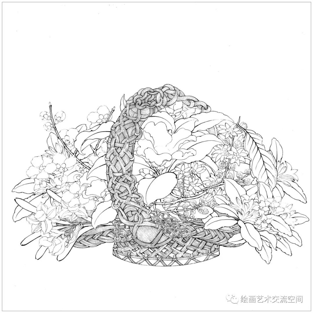 花篮:黄色部分,用淡赭色将所有的蔑丝勒一次后,再用浓粉黄顺着线条的另一边复勒。勒的时候,遇到物体交叠处,线条要虚化。深色部分:也