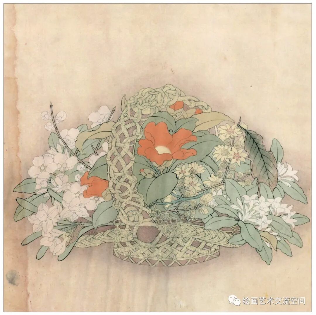 花篮:黄色以及白色部分都平涂淡粉黄色,深色部分都平涂中等浓度的墨红色(曙红加稍许墨)。