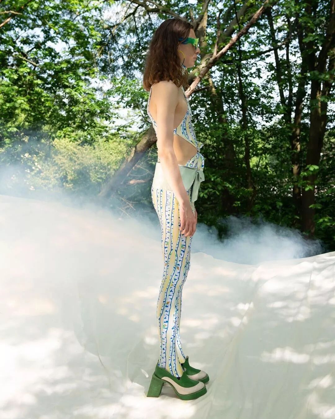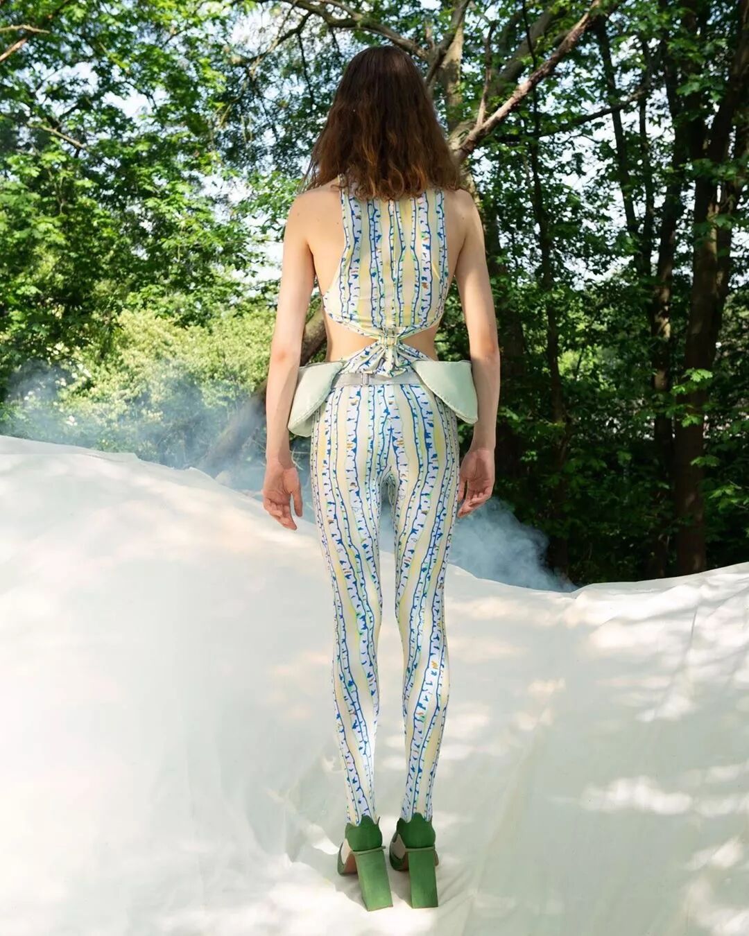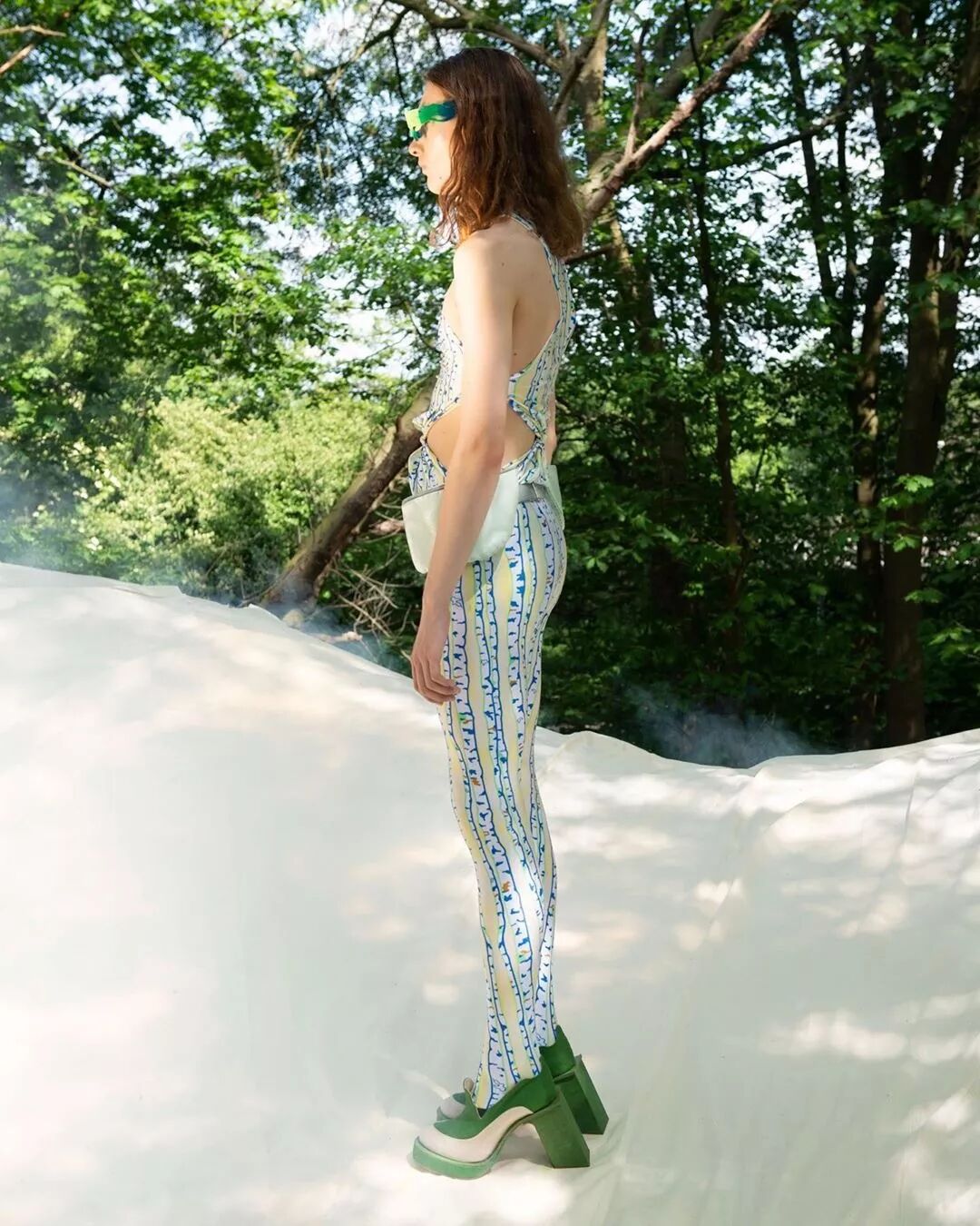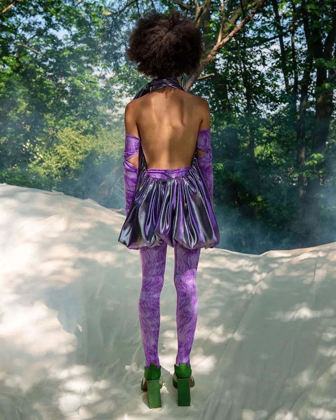 “森林狂欢的一个缺点是派对结束后留下的垃圾。这是我真正想要考虑的事情,尤其是考虑到日益加剧的气候危机。我一直积极地包括尽可能多的剩余材料,甚至是在街上发现的物品。使用的大部分材料都是其他设计师或我周围的人留下的。一些例子是我在安特卫普河边发现的向上循环的笑气罐,我把它们变成了珠宝。我还用安特卫普一家针织公司剩下的绳子编织了一件上衣和各种服装细节。”——Linus Leonardsson