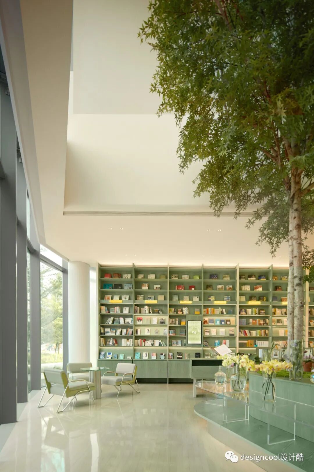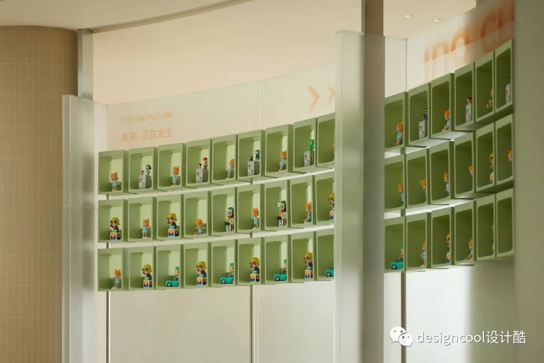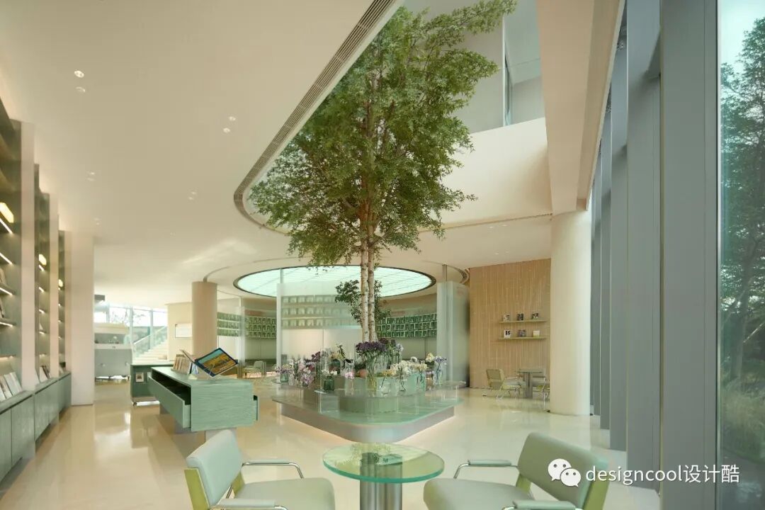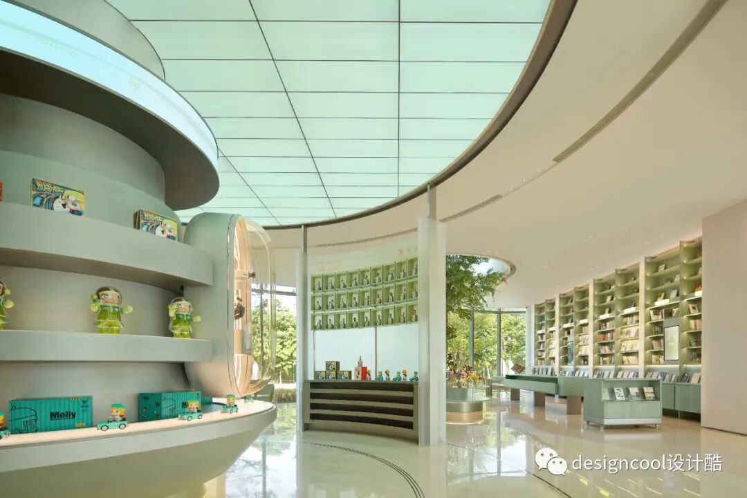 潮玩杂货区提取树的形态,结合天花灯膜形成树状陈列柱,加入符合年轻人审美的潮玩,聚集有着同样喜好的群体。另外,我们尝试把社区公共空间设计得更像一个家,注入阅读、花艺、咖啡,为年轻人提供安全感和生活小确幸。