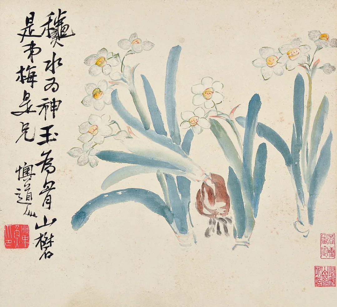 可见他对自己用水之法颇为自得,欣赏此册,便可见其用水之妙。如“芙蓉翠鸟”一帧,纯用色笔,而有淡冶灵动的美感,正是由于其水分恰如其分的运用,浓不损韵,淡不伤神,火候把握极为到位。水仙一帧,取法自南田没骨,而以书法用笔写出,层次丰富,节奏明快。李鱓的水墨画以行草用笔写出,墨荷一帧,水墨互用,浓淡相宜,十分精彩。