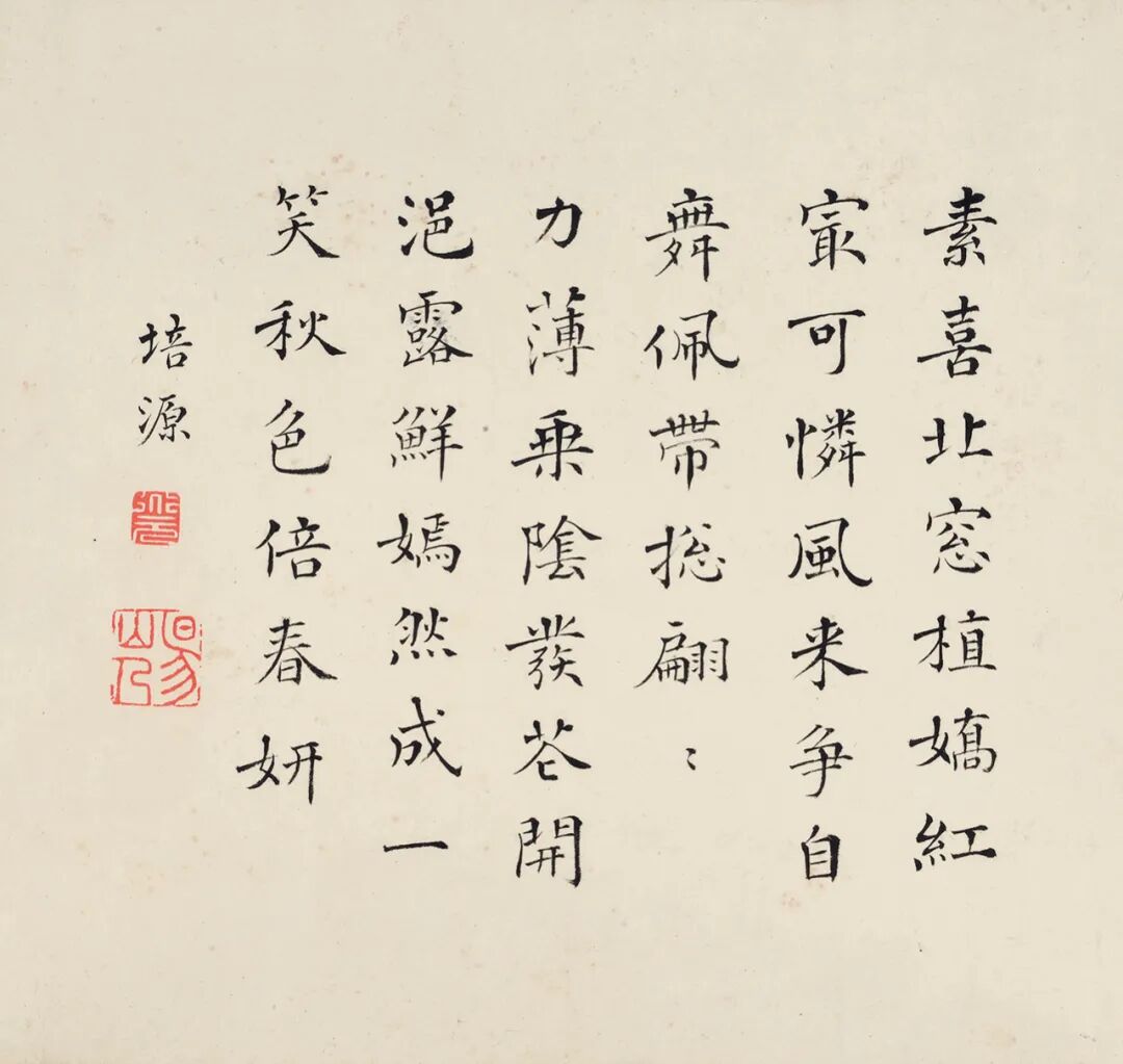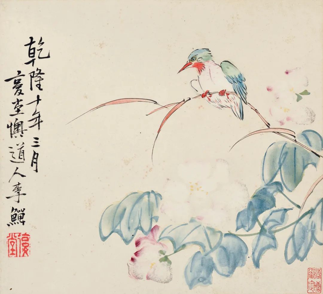 此册为李鱓所作花鸟册页精品,水墨与设色兼用,风格清丽,气象空灵。对题者为同时代的李培源,李为乾隆十九年(一七五四)拔贡,官训导。据《兴化县志》记载,其正书力追颜真卿。尝言作字须读书数日,方可落笔。郑燮推为邑中三百年楷书第一。