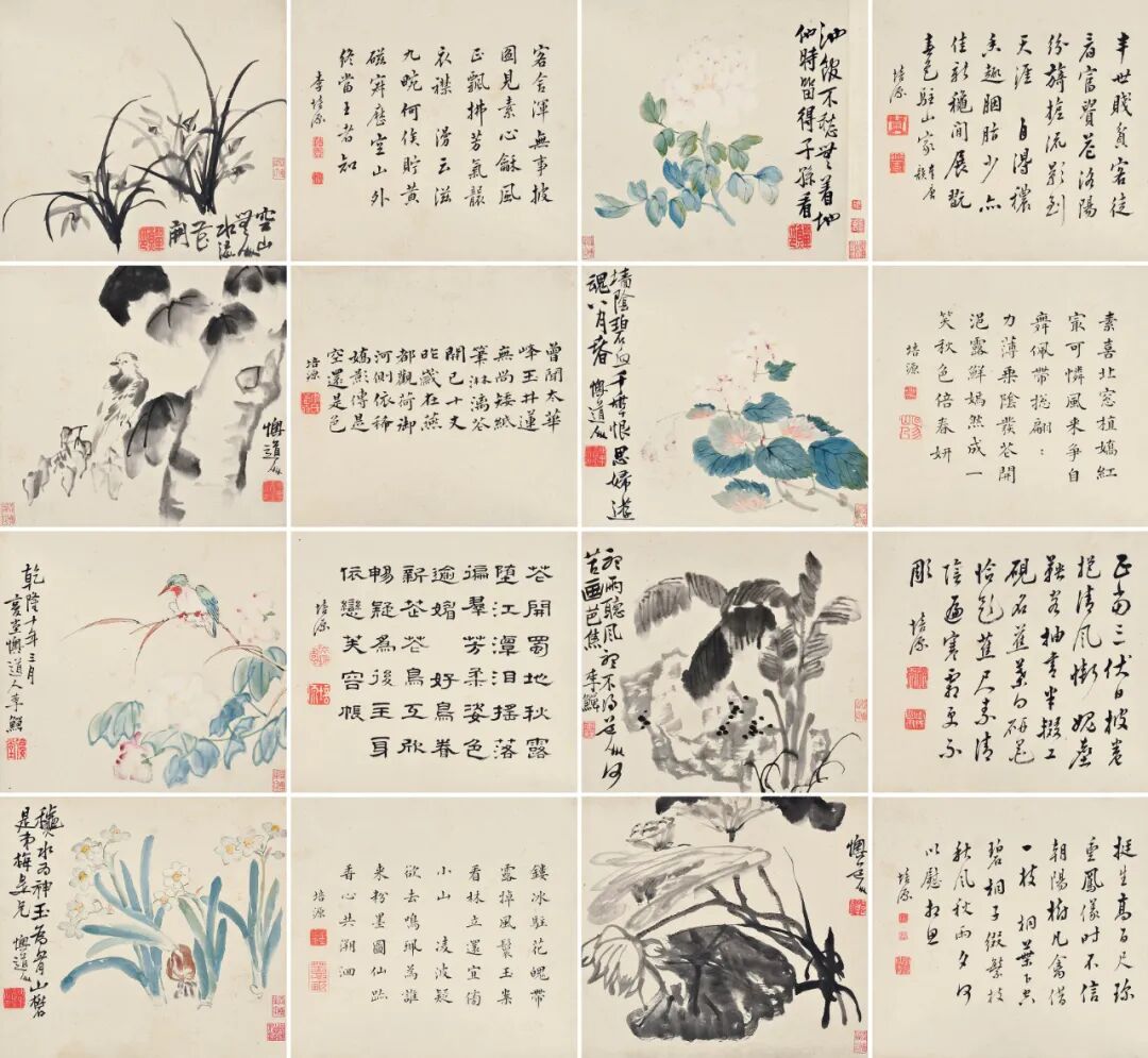 是册为李鱓小品画中精品,更有同时李培源以各体书法所作对题,内容紧扣主题,诗、书、画相互辉映,可称三绝。