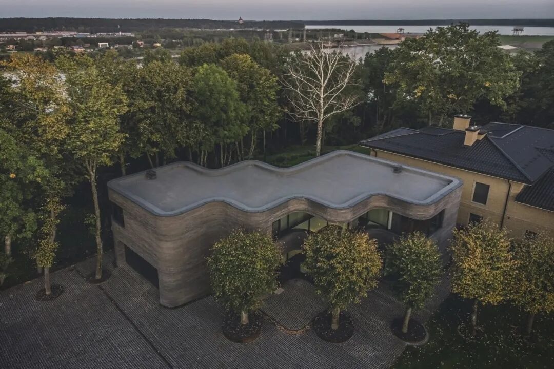 房子的构成保持了考纳斯现代主义的精神,因为房子的体积四捨五入给建筑带来了现代主义的印象。弯曲的墙壁、弯曲的转角窗玻璃营造出一种暗示,让人想起两次世界大战之间的建筑,它厚重、不朽,以高房间高度、高卧室为特征。目的是营造一种宽敞的感觉,因为空地的大小和考纳斯潟湖的规模似乎都决定了房子的体积。弧形手工砖用于建造房屋。