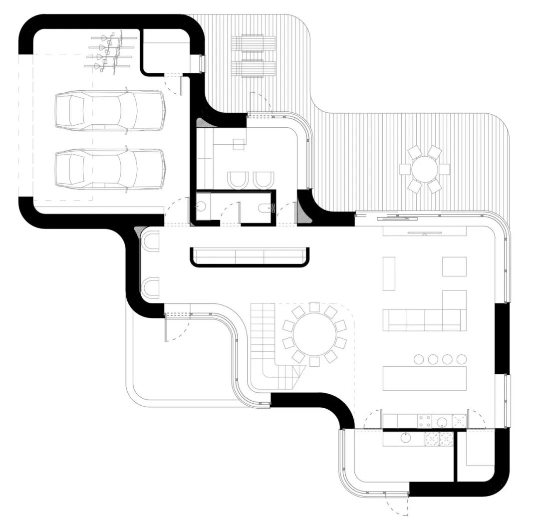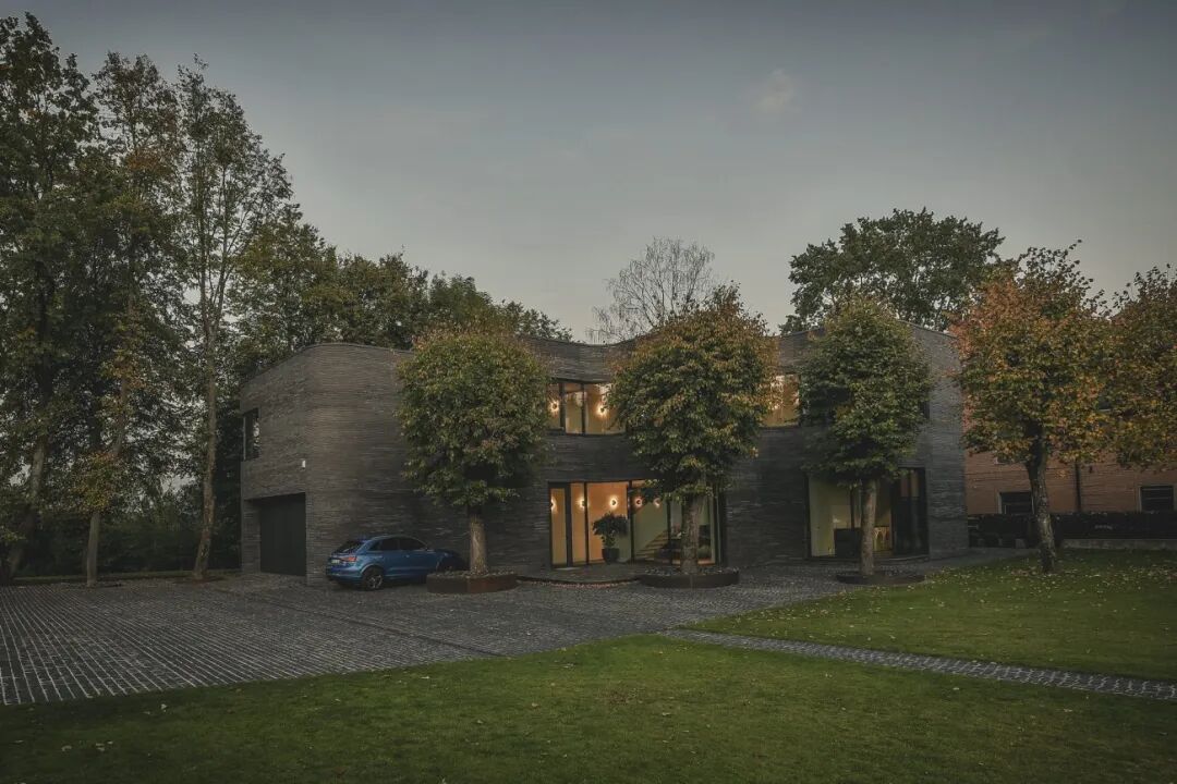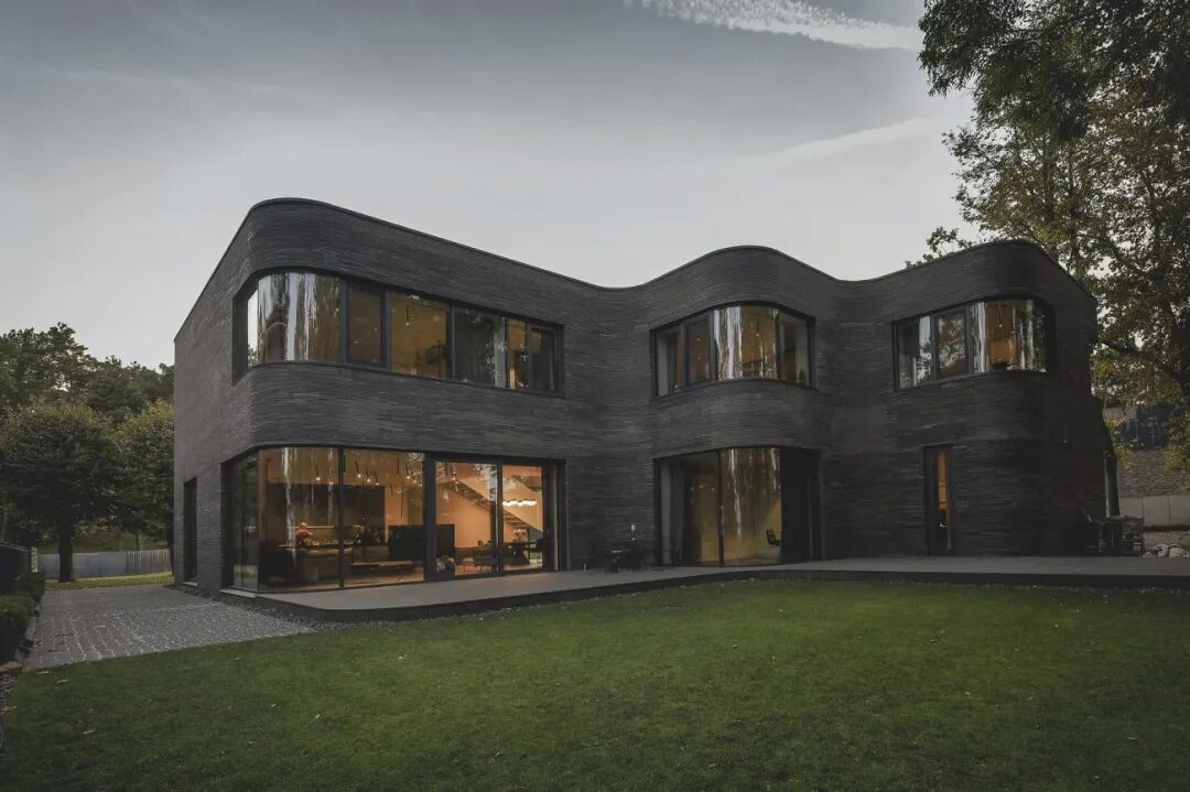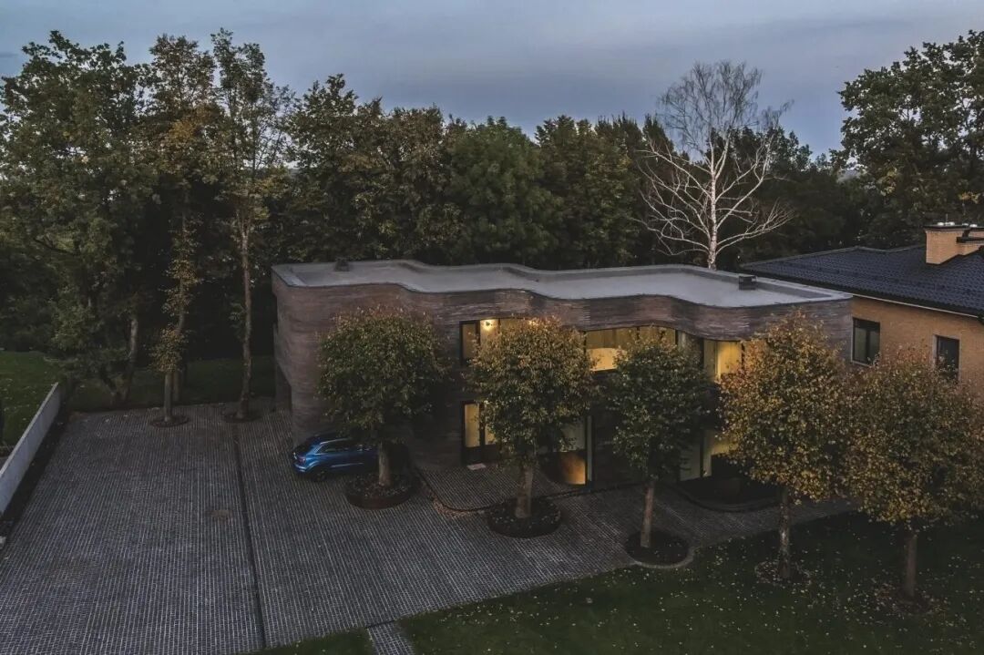 The composition of the house keeps the spirit of Kaunas modernism alive, as the rounding of the volumes of the house gives the building the impression of modernism. Curved walls, curved corner window panes create a kind of hint, a reminiscence of the interwar architecture, which is heavy, monumental, characterized by high room heights, high bedrooms. The aim was to create a feeling of spaciousness, because both the size of the empty plot and the large scale of the Kaunas Lagoon seem to dictate the massiveness of the volume of the house. Curved handmade bricks are used to build the house.